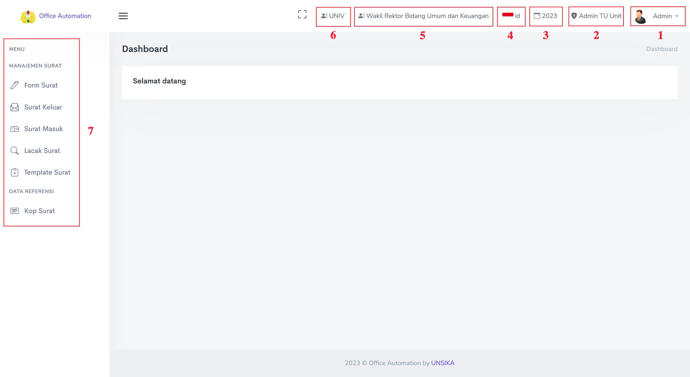 Setiap pengguna akan memiliki role atau kewenangan masing-masing. Sehingga pada halaman dashboard pengguna akan menampilkan menu sesuai dengan kewenangan pengguna tersebut. Contoh halaman dashboard pengguna dapat di lihat pada gambar dibawah ini.