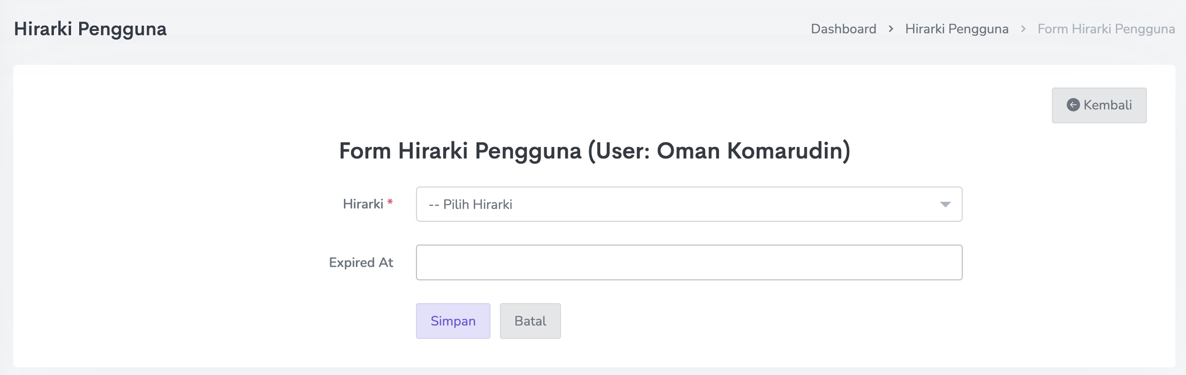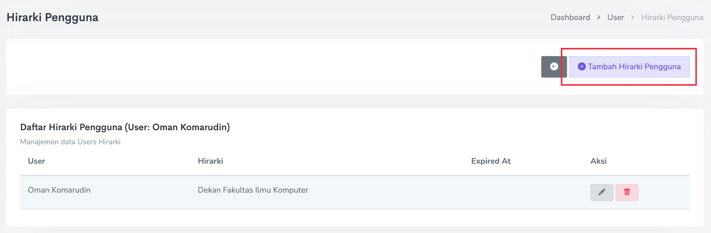 Setelah diberikan role, maka selanjutnya pengguna tersebut harus diberikan hirarki unit dengan cara klik ikon Hirarki pada kolom aksi