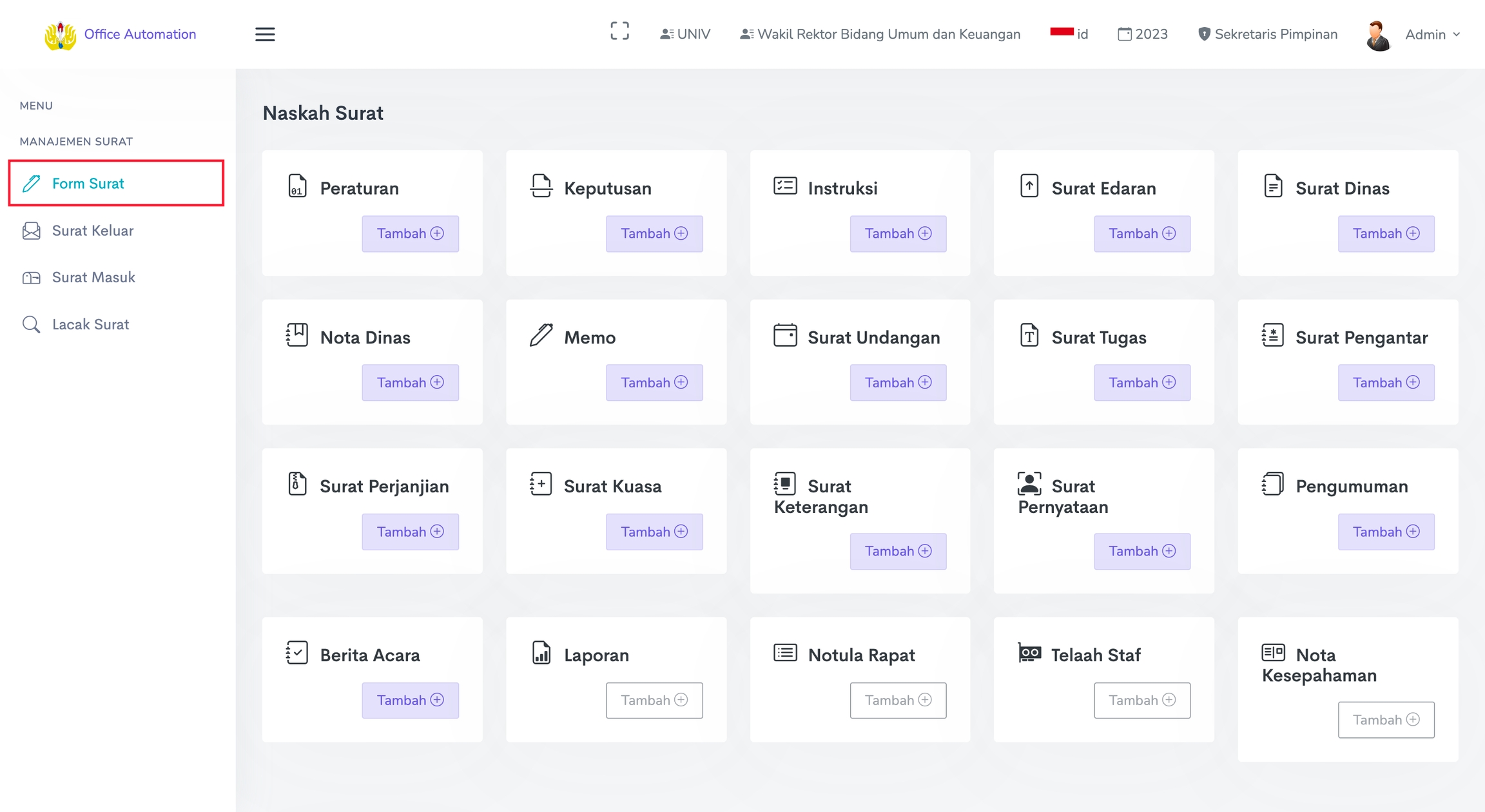 Klik menu pintasan Form Surat yang akan mengarahkan pengguna untuk membuat surat dari daftar template surat yang telah disediakan. Menu ini juga bisa diakses melalui menu Surat Keluar dan klik tombol Tambah Surat Keluar sehingga akan tampil seperti pada gambar berikut