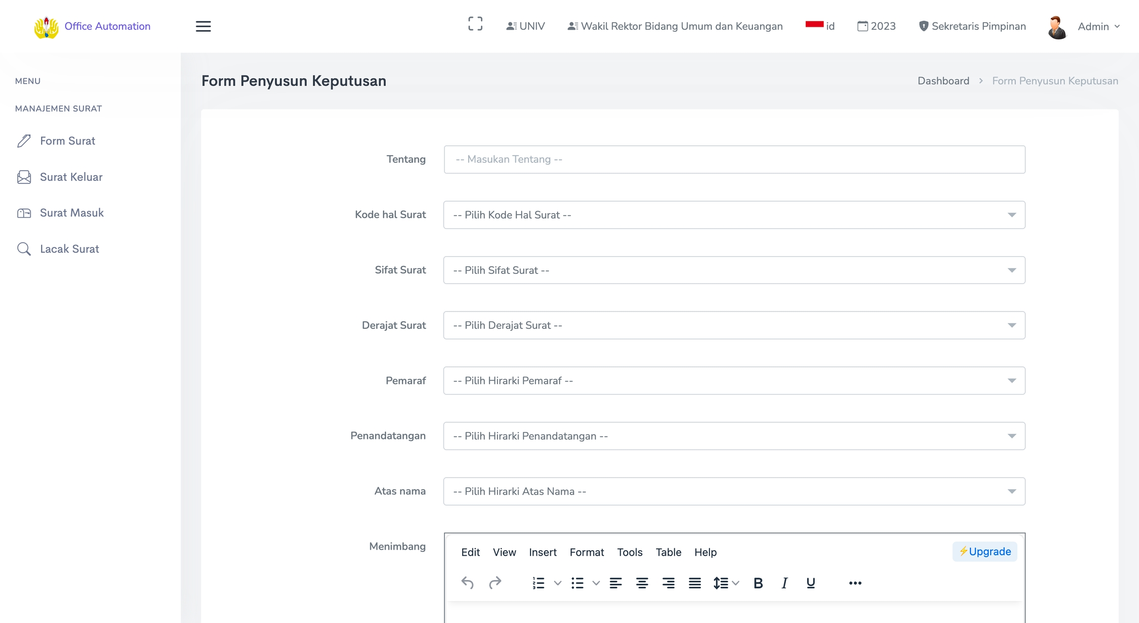 Pilih jenis naskah surat yang akan dibuat, sehingga akan muncul form isian yang harus dilengkapi