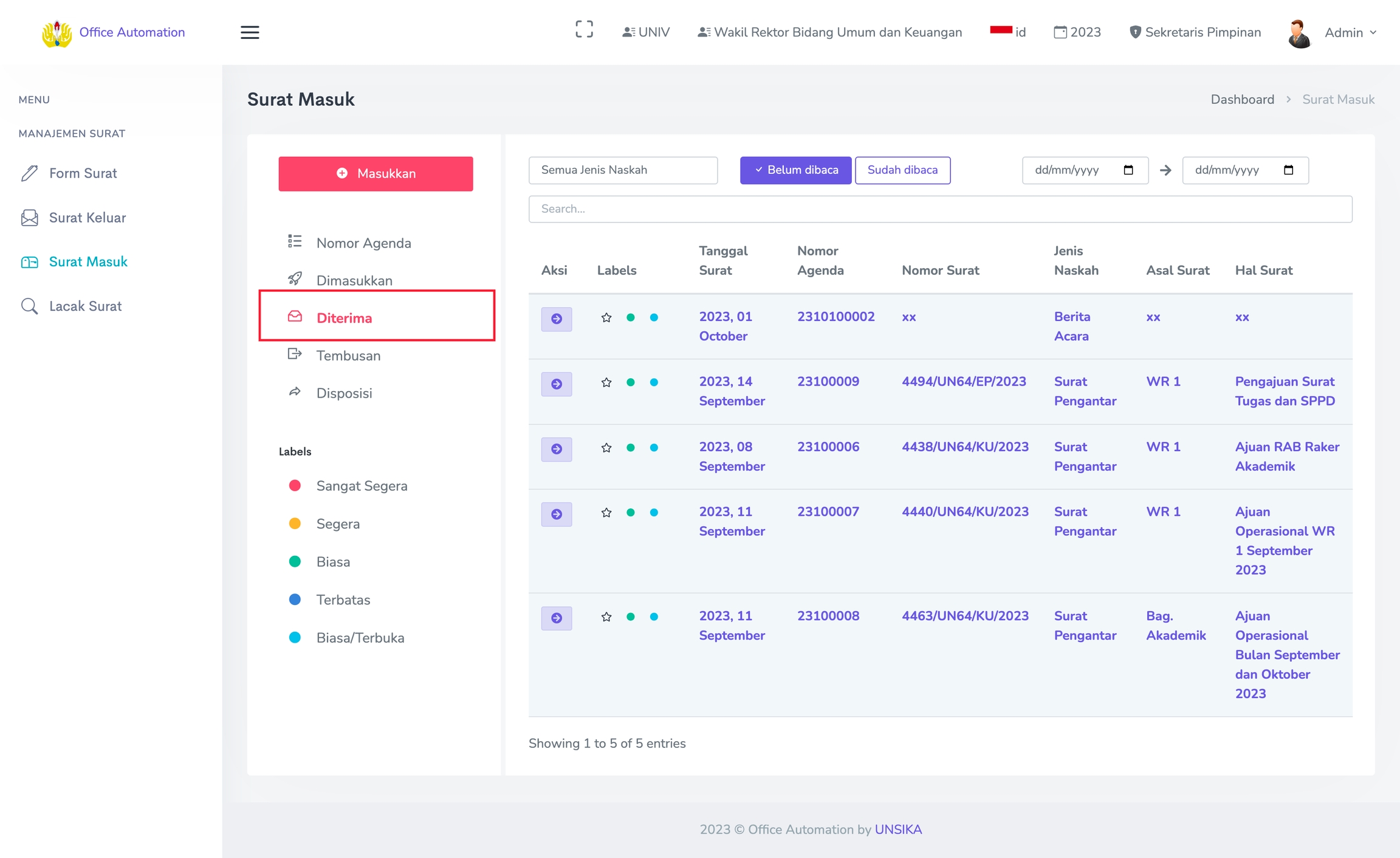 Menu Surat Diterima digunakan untuk melihat surat yang dikirim dari unit lain kepada pengguna.