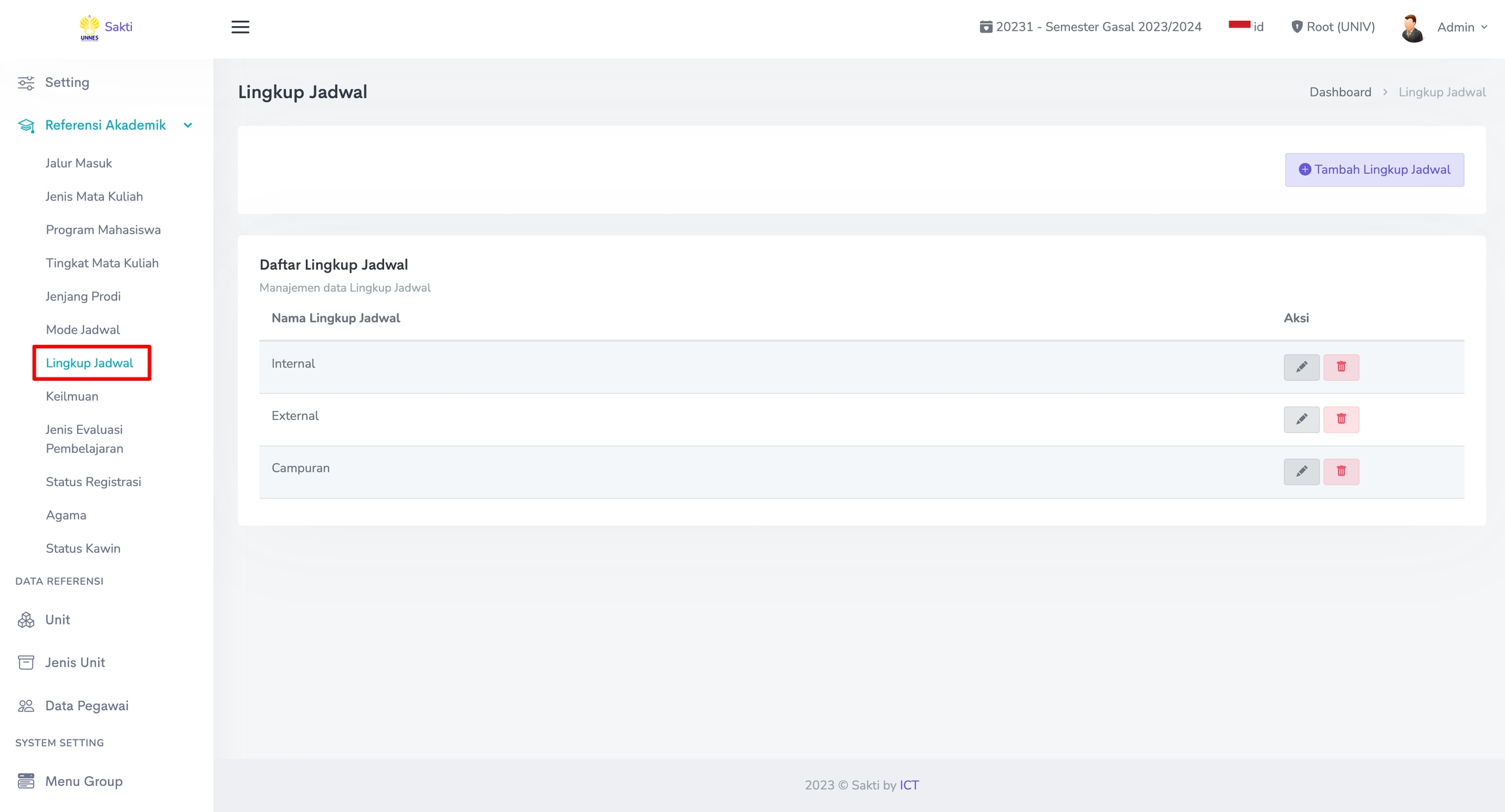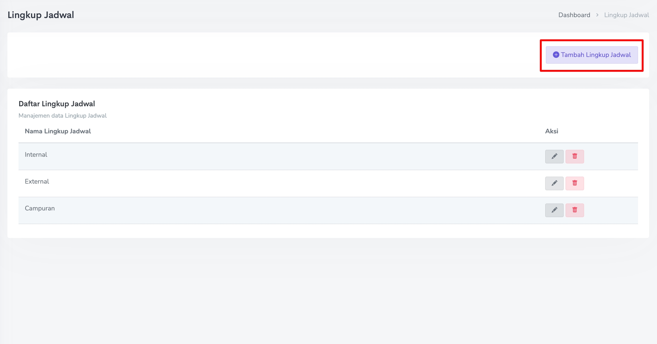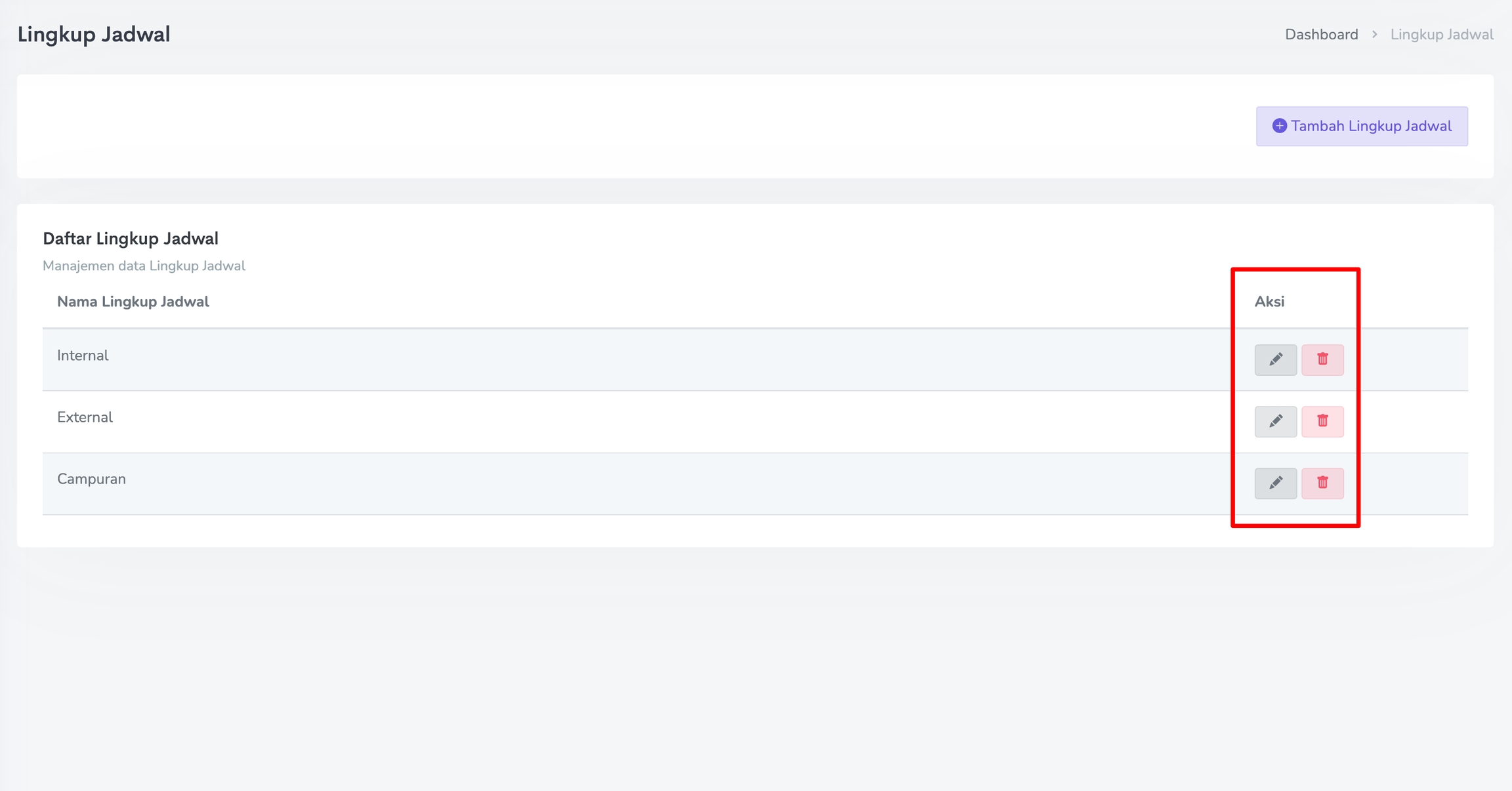 Untuk melakukan perubahan pada Lingkup Jadwal, klik pada Ikon Pensil. Sedangkan untuk menghapus Lingkup Jadwal, klik pada Ikon Trash seperti gambar berikut.