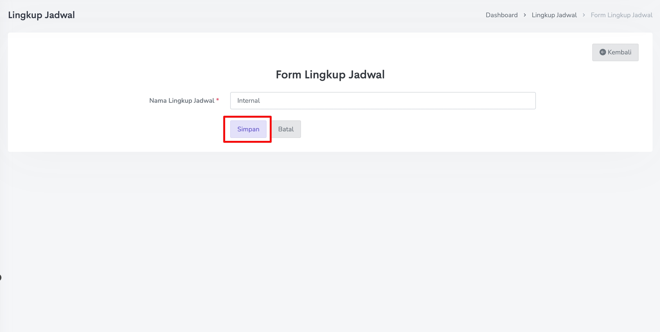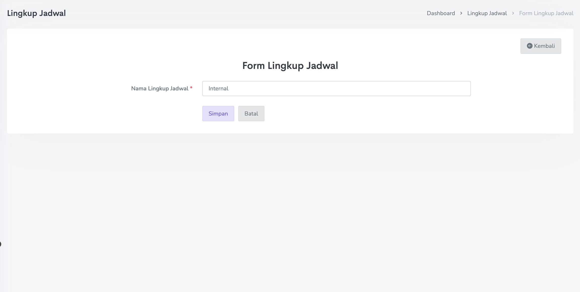 Untuk menambahkan Lingkup Jadwal, klik tombol Tambah Lingkup Jadwal pada menu Lingkup Jadwal.
