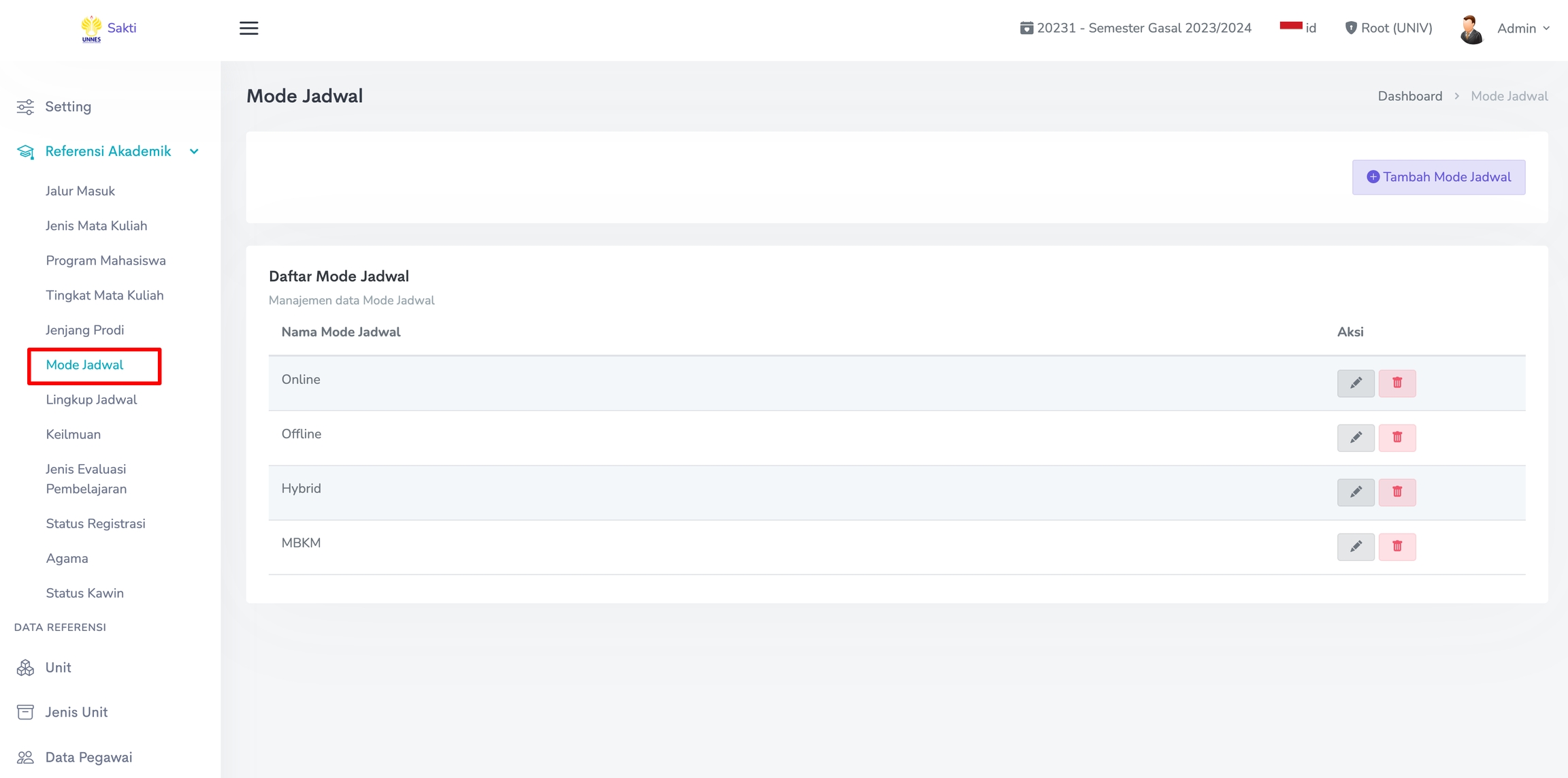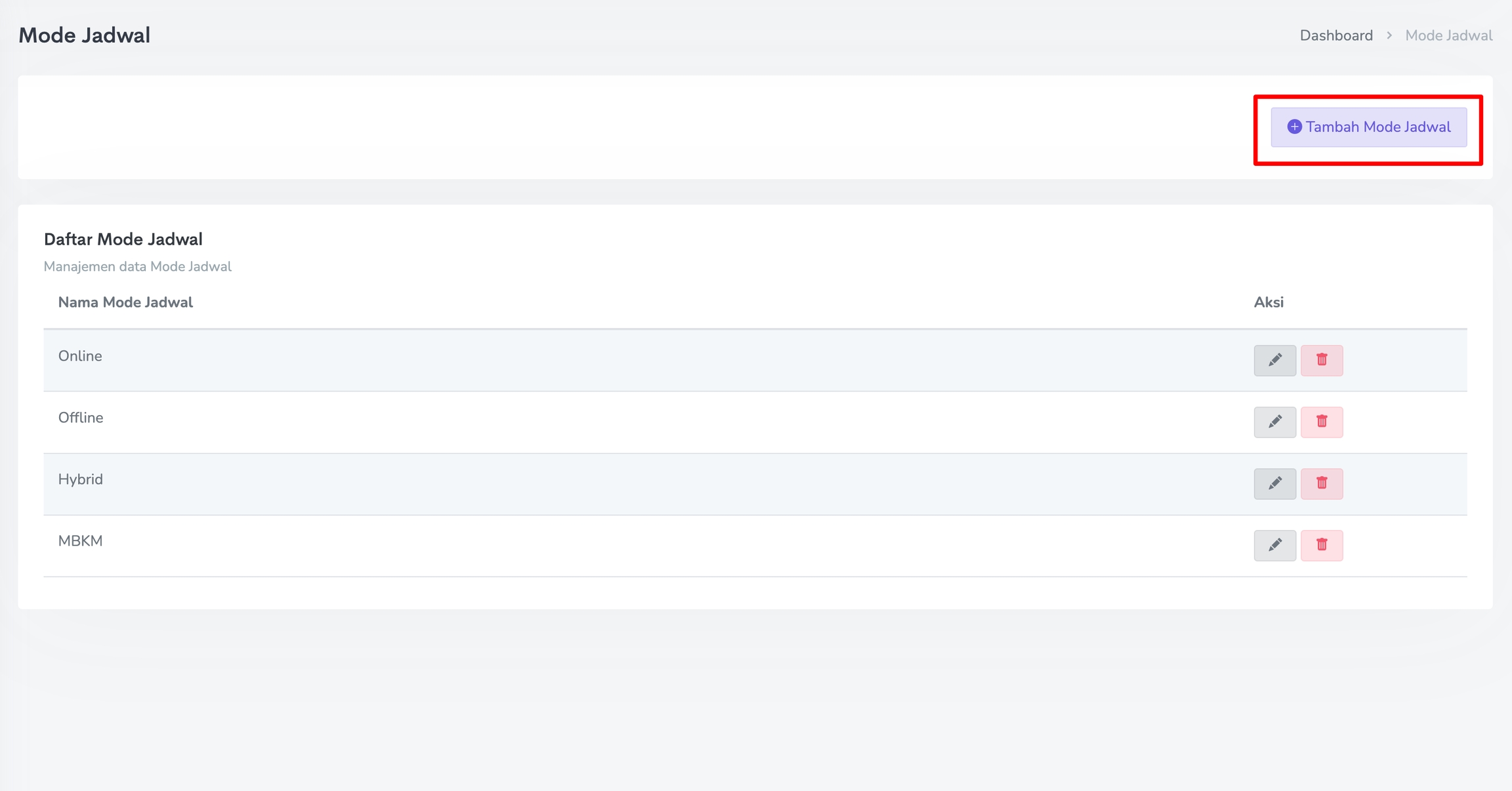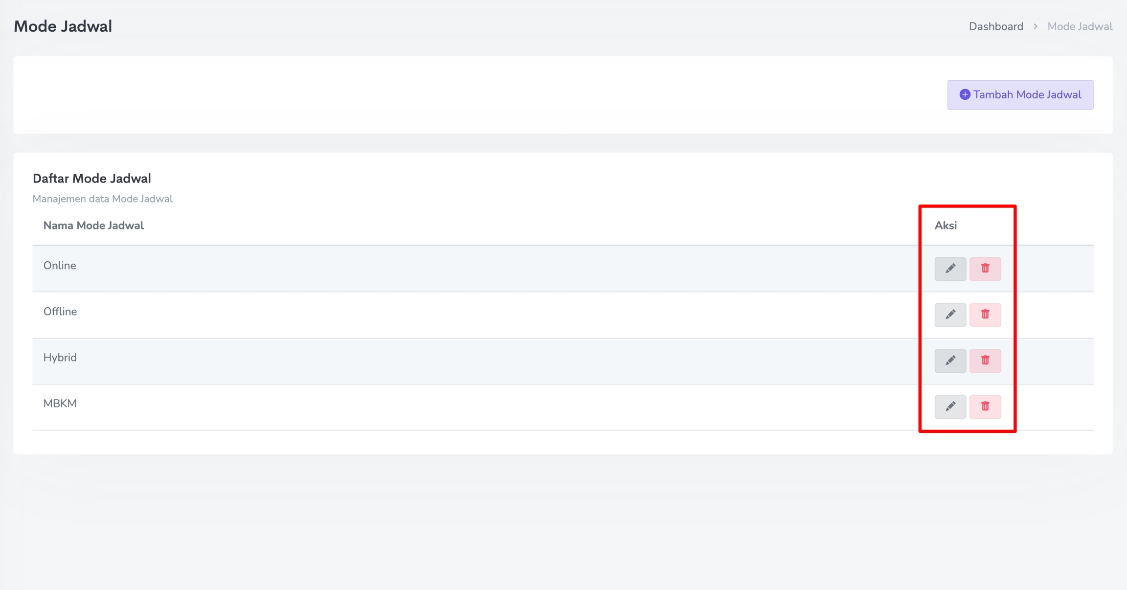 Untuk melakukan perubahan pada Mode Jadwal, klik pada Ikon Pensil. Sedangkan untuk menghapus Mode Jadwal, klik pada Ikon Trash seperti gambar berikut.