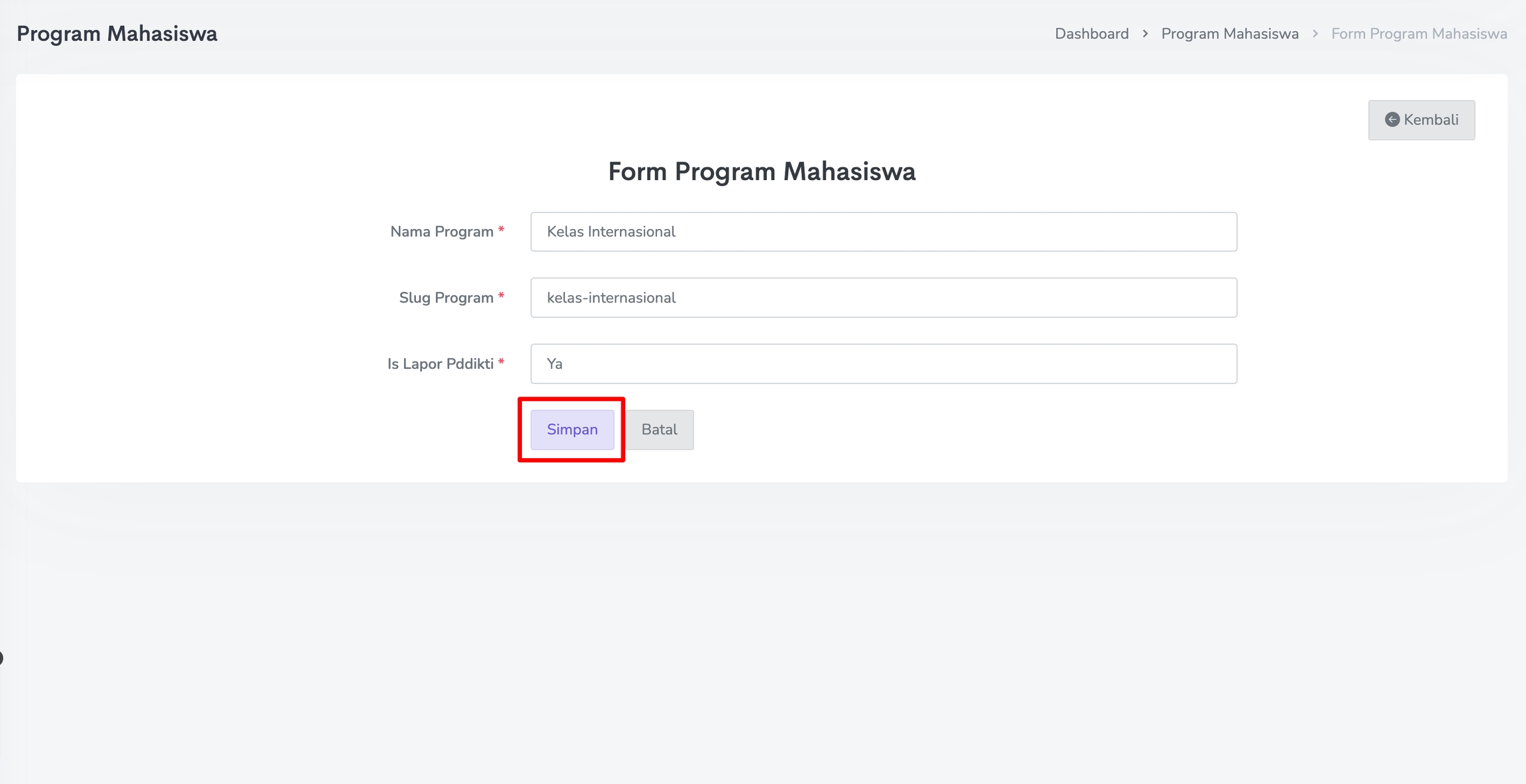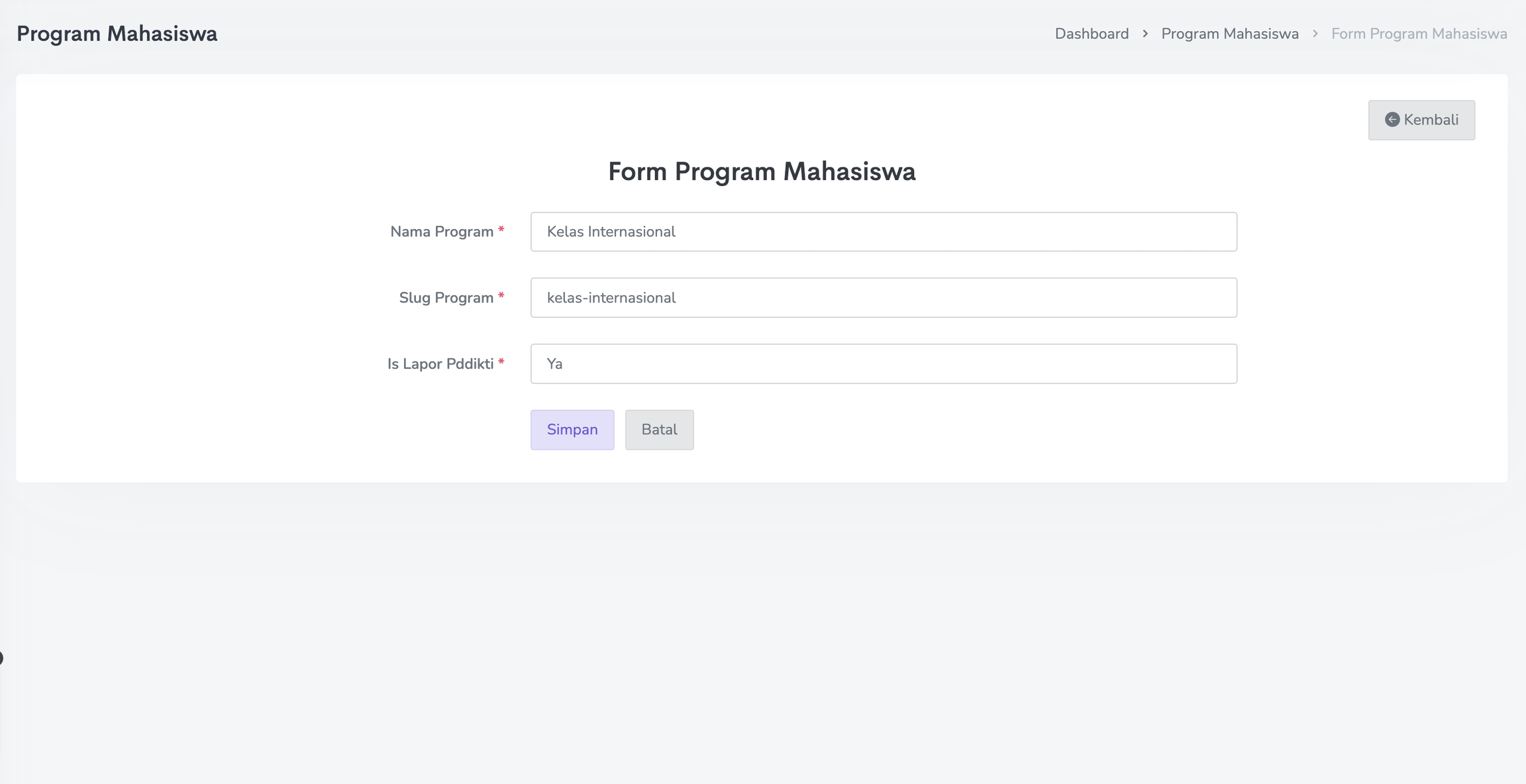 Isi Form Program Mahasiswa secara lengkap mulai dari Nama Program, Slug Program dan Is Lapor Pddikti.