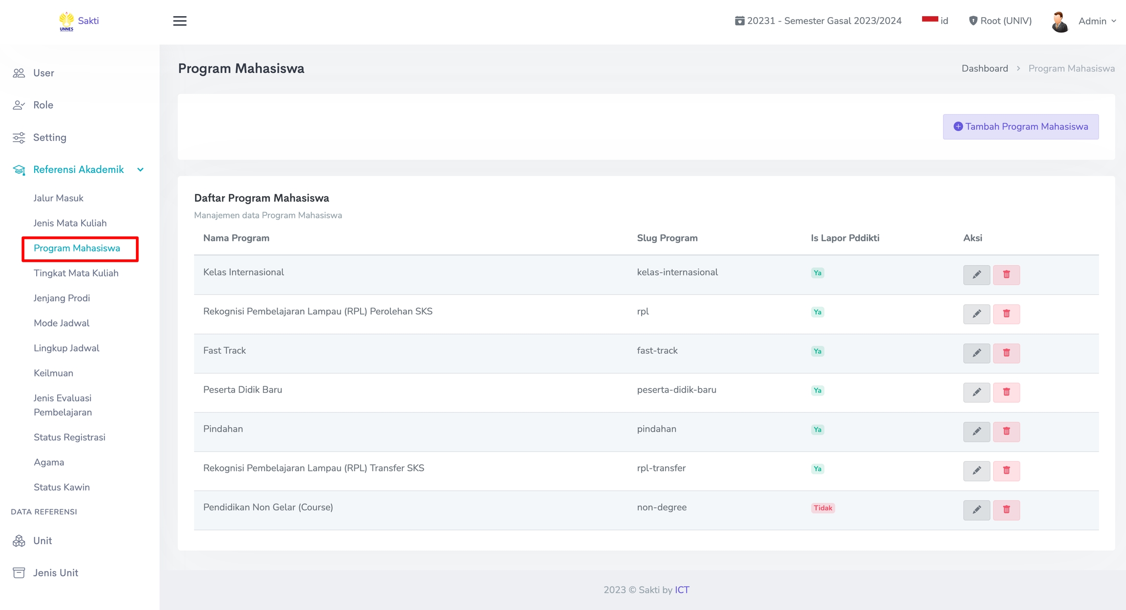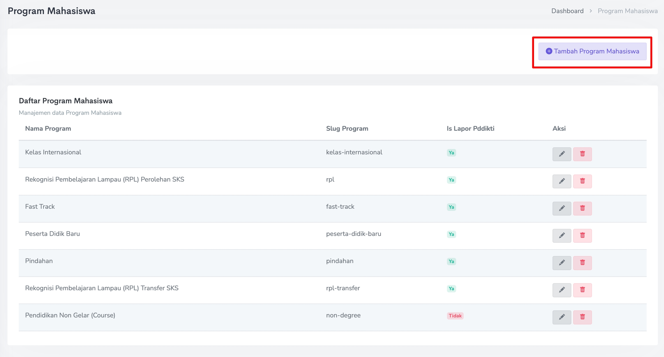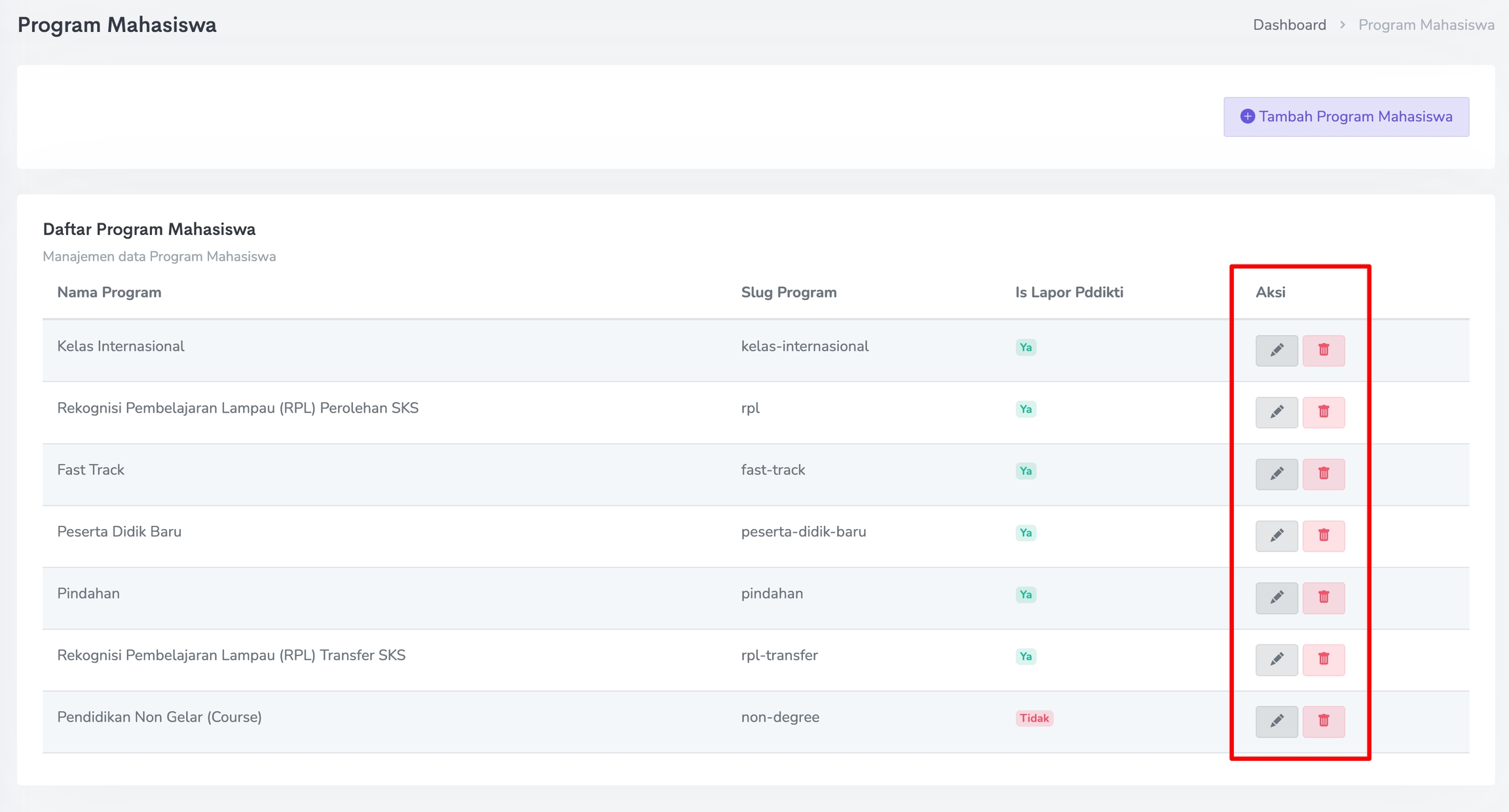 Untuk melakukan perubahan pada Program Mahasiswa, klik pada Ikon Pensil. Sedangkan untuk menghapus Program Mahasiswa, klik pada Ikon Trash seperti gambar berikut.