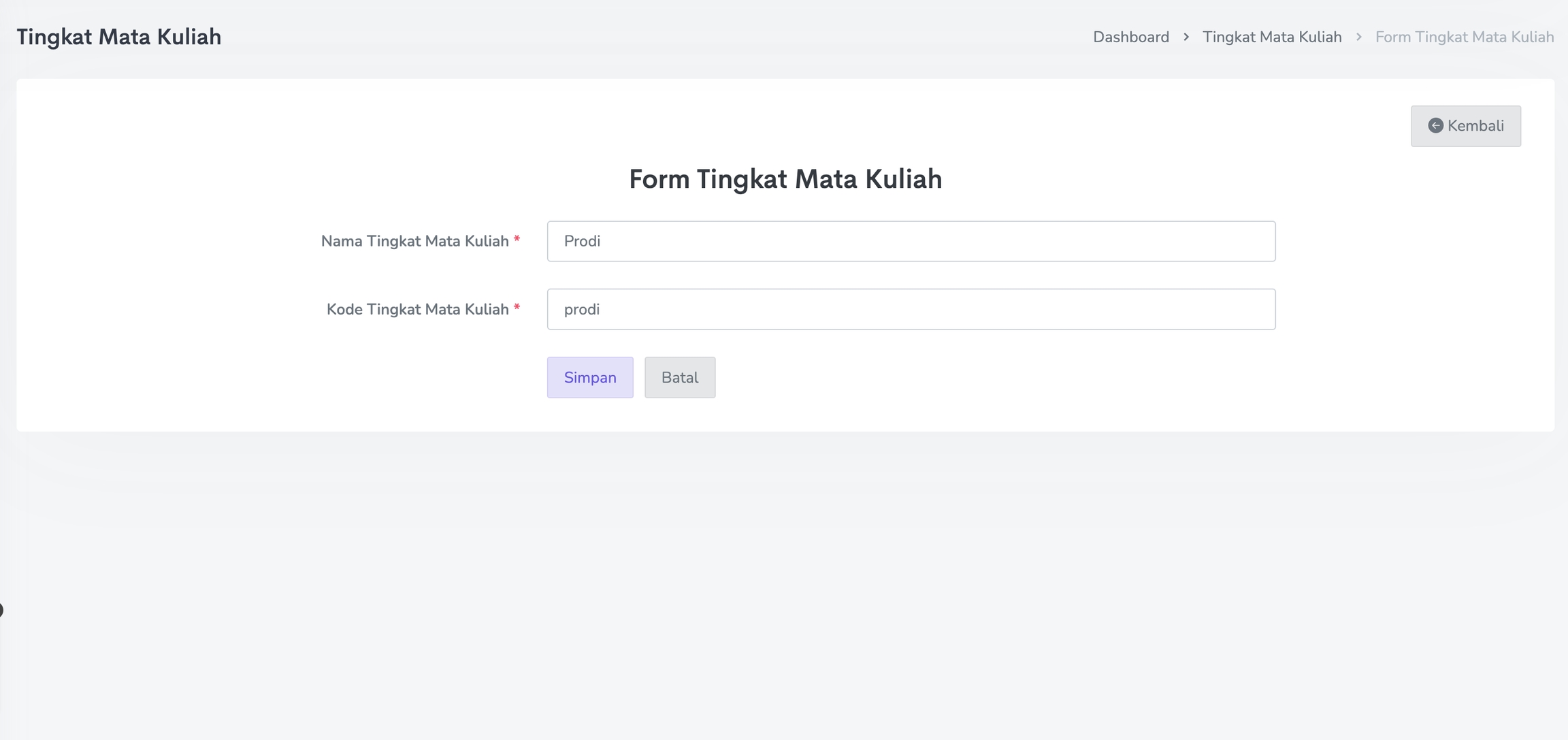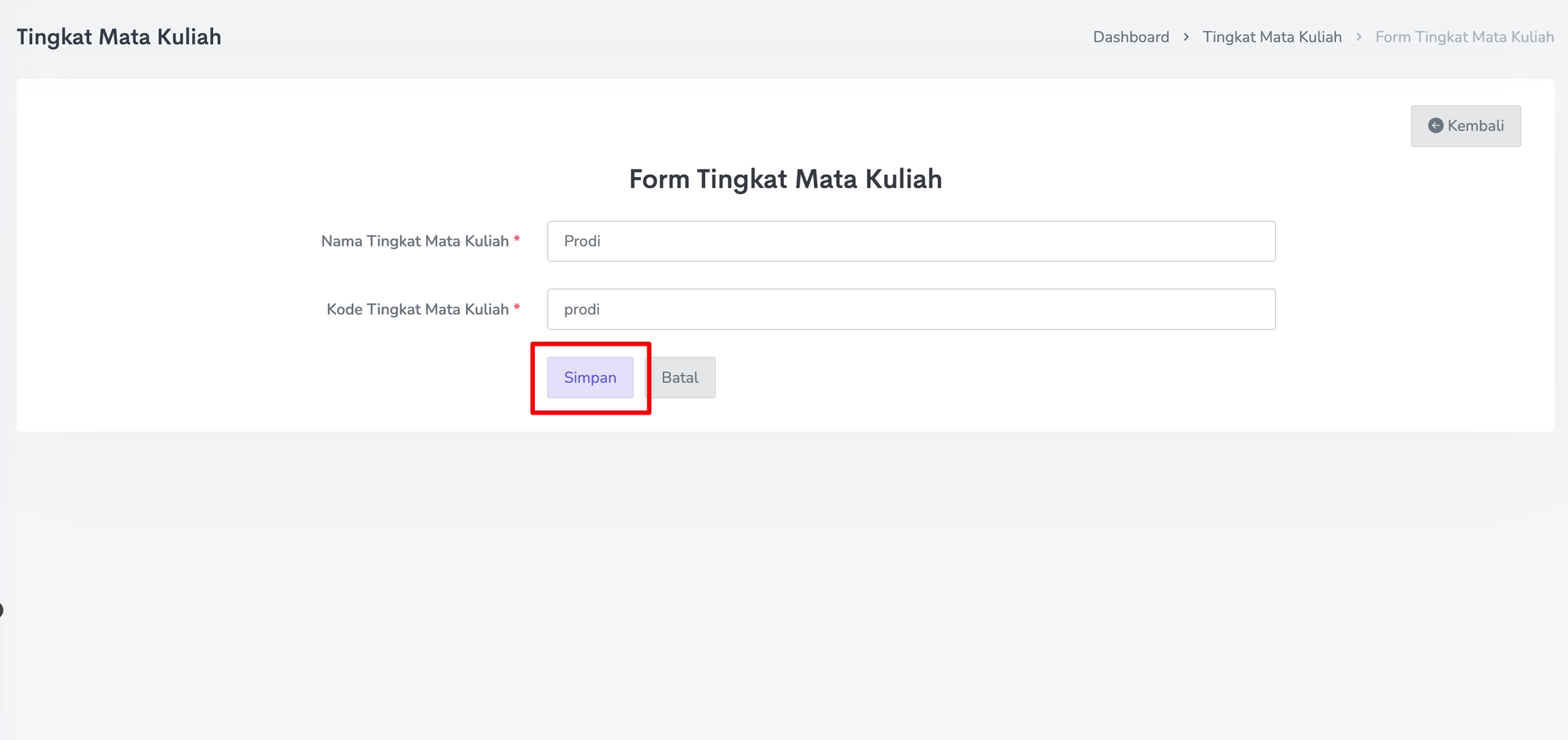 Isi Form Tingkat Mata Kuliah secara lengkap mulai dari Nama Tingkat Mata Kuliah dan Kode Tingkat Mata Kuliah.