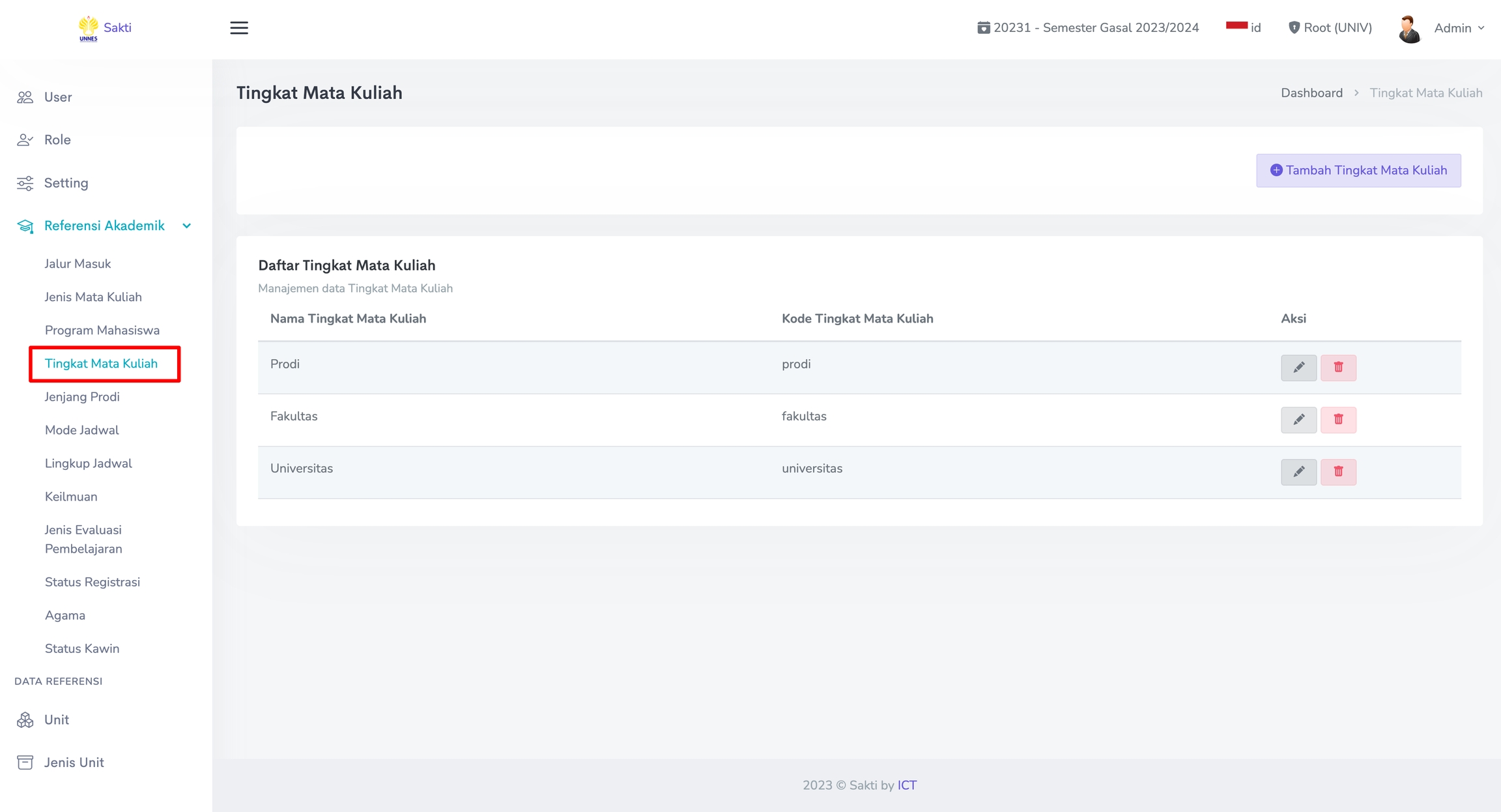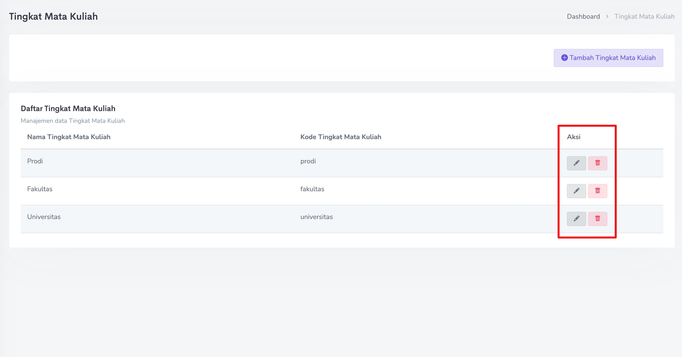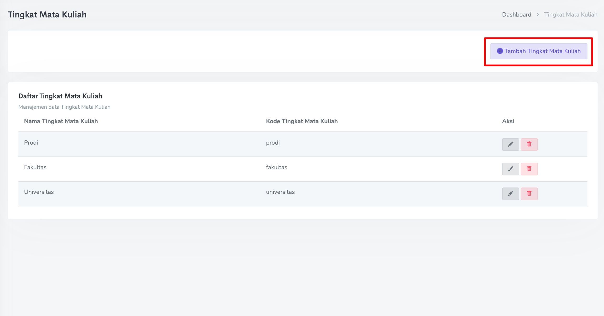 Untuk melakukan perubahan pada Tingkat Mata Kuliah, klik pada Ikon Pensil. Sedangkan untuk menghapus Tingkat Mata Kuliah, klik pada Ikon Trash seperti gambar berikut.