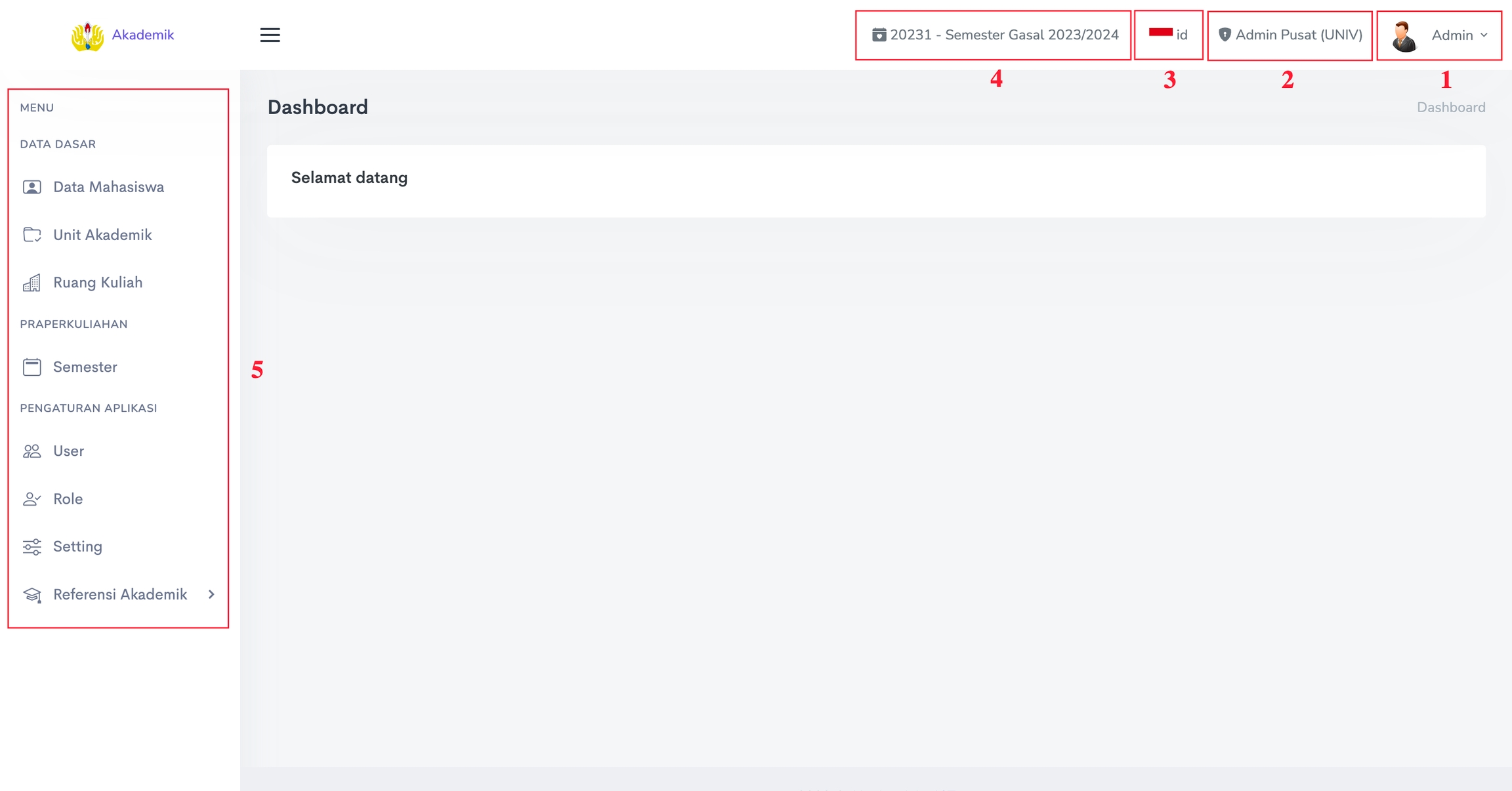 Setiap pengguna akan memiliki role atau kewenangan masing-masing. Sehingga pada halaman dashboard pengguna akan menampilkan menu sesuai dengan kewenangan pengguna tersebut. Contoh halaman dashboard pengguna dapat di lihat pada gambar dibawah ini.
