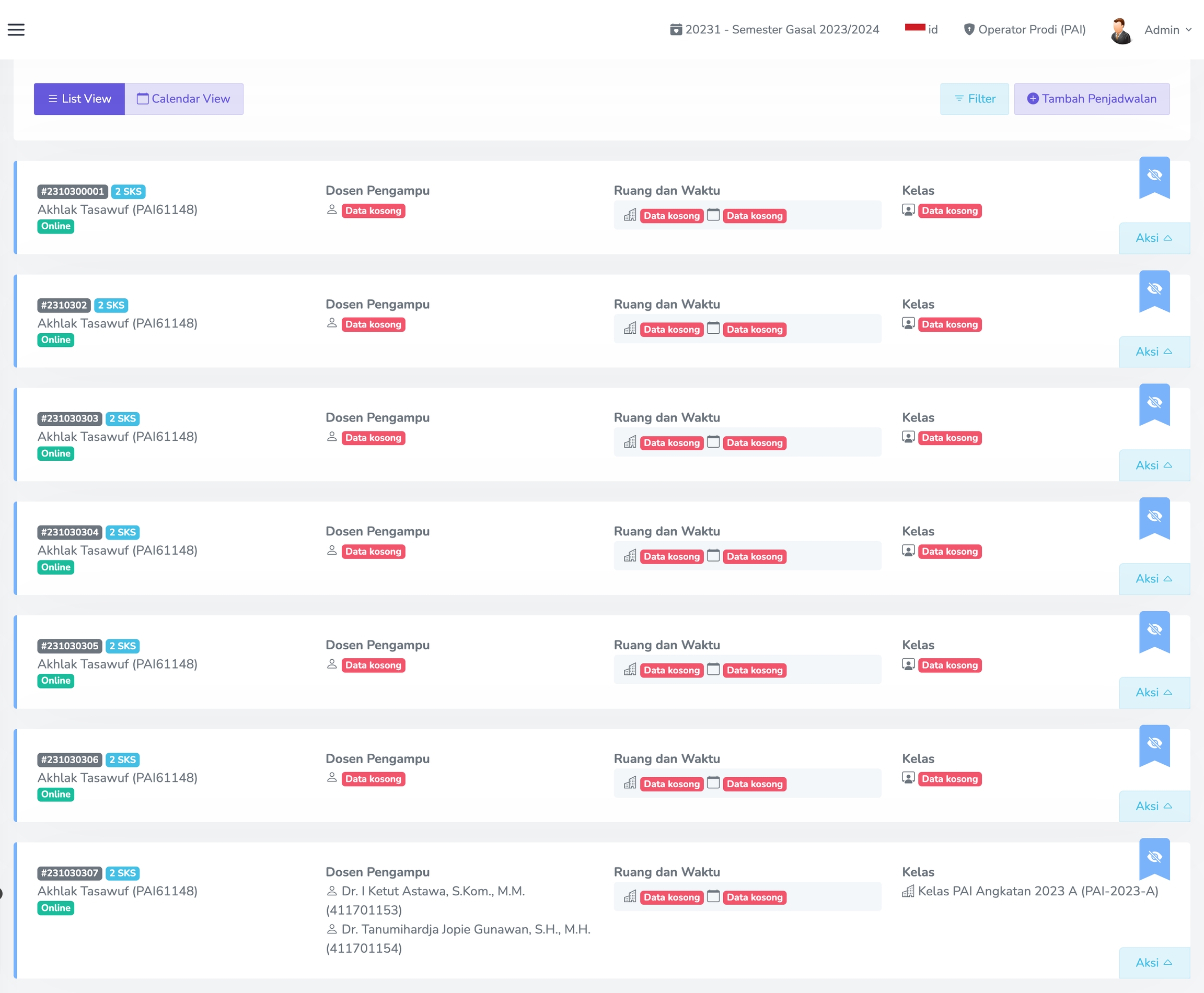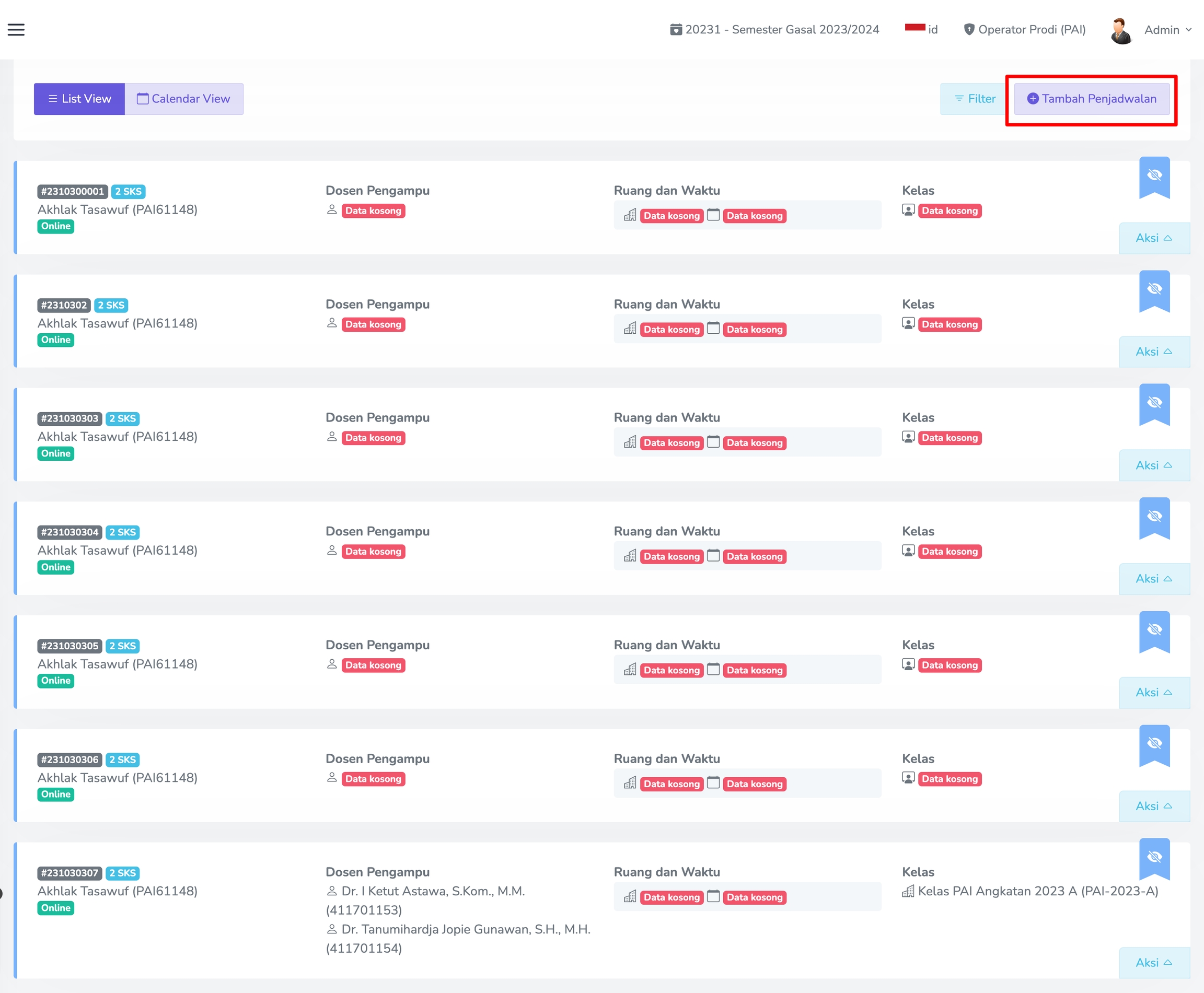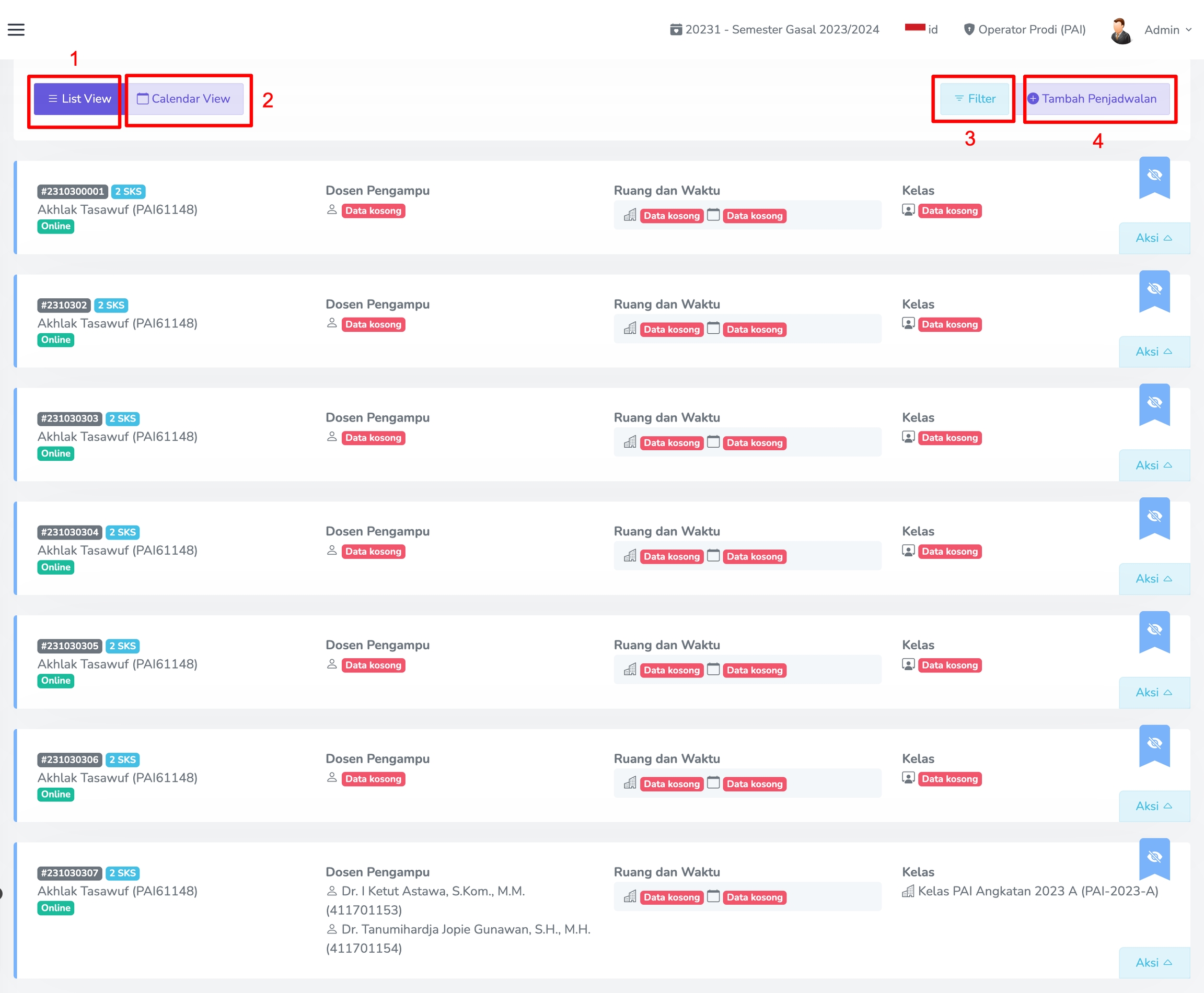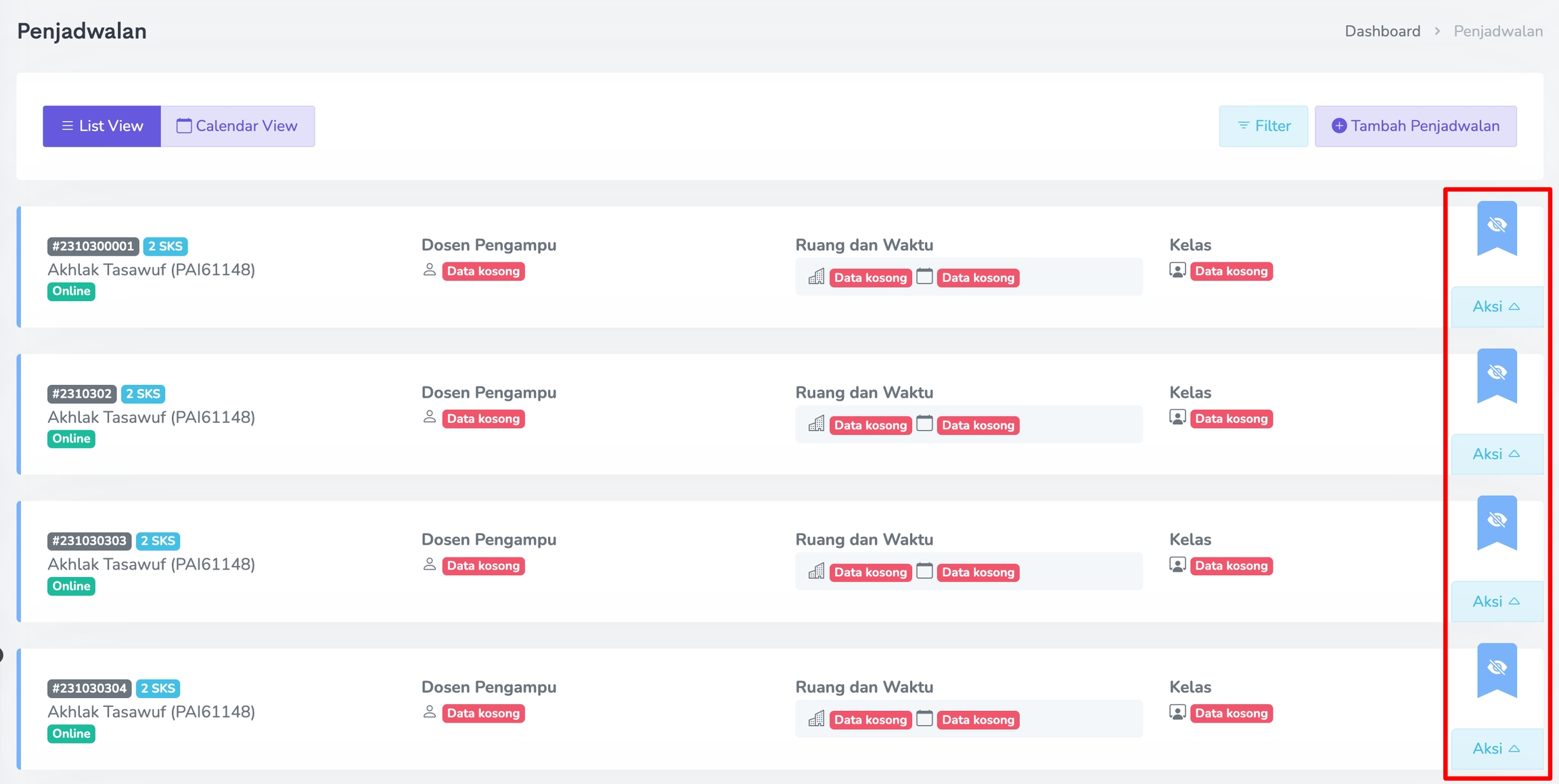 Menu ini berfungsi untuk manajemen data Penjadwalan. Jika sudah menambahkan Penjadwalan akan ada Daftar Penjadwalan, seperti yang terlihat pada gambar berikut.