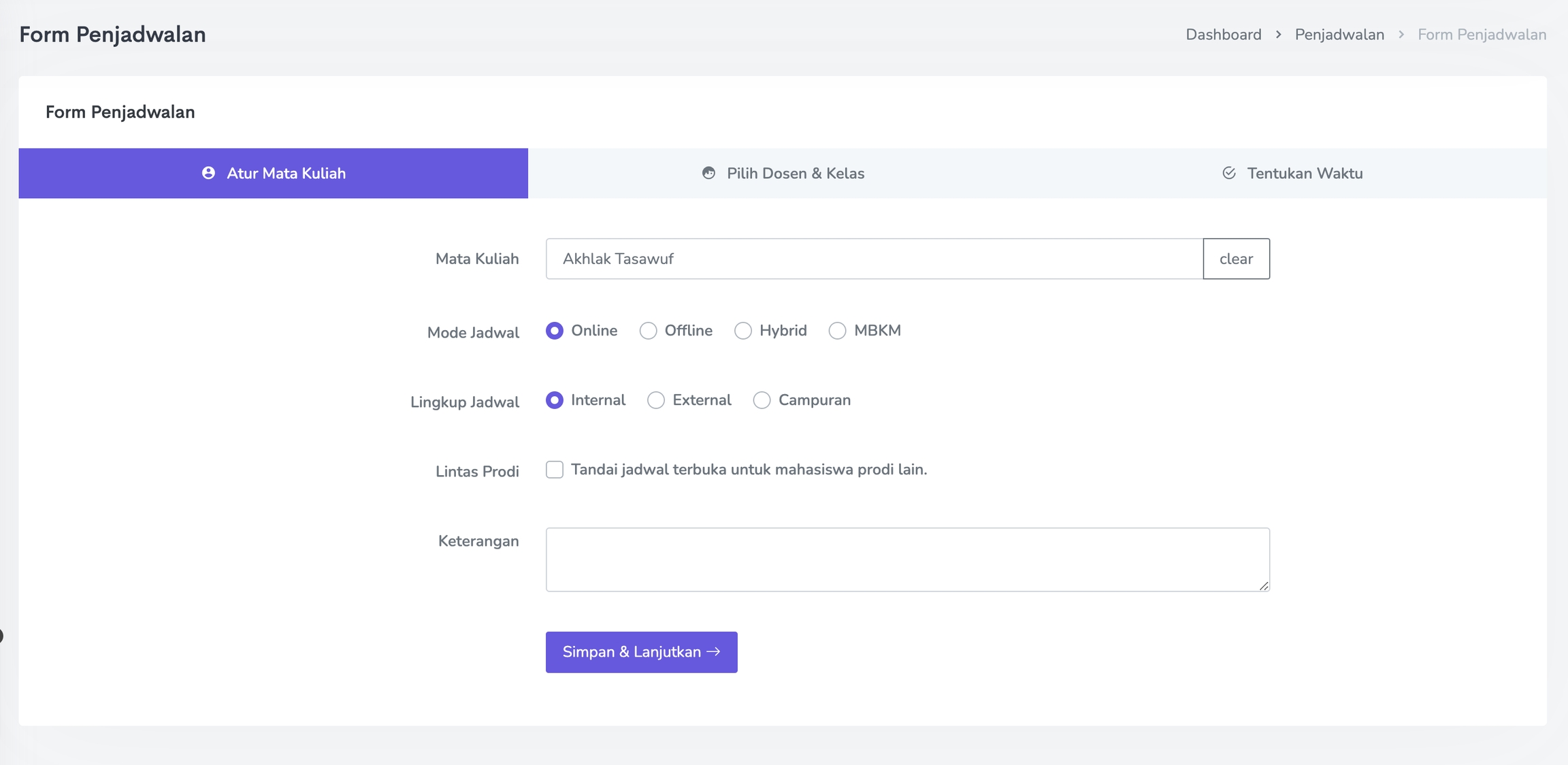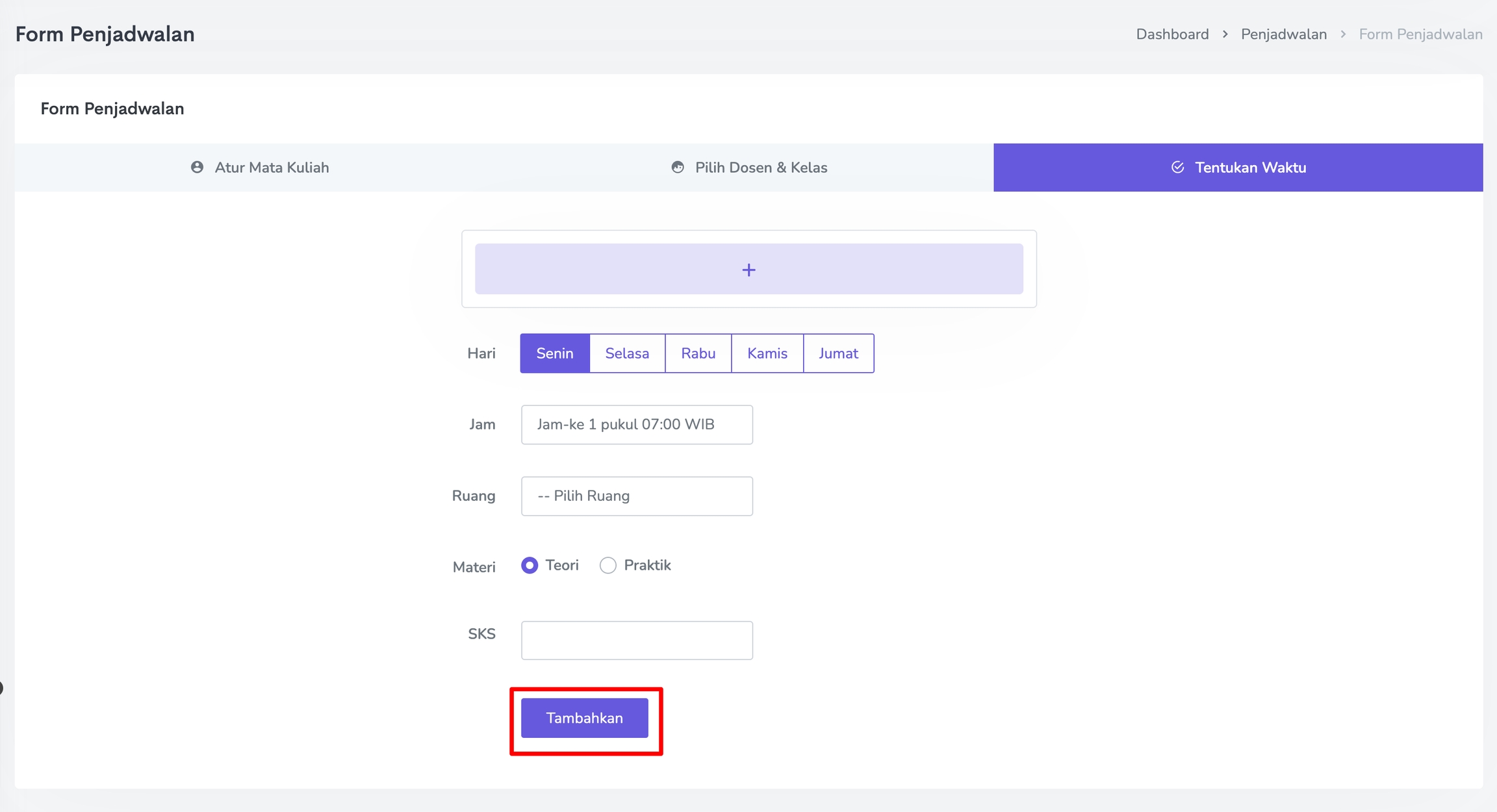 Isi Form Penjadwalan secara lengkap mulai dari Atur Mata Kuliah, Pilih Dosen dan Kelas, serta Tentukan Waktu.