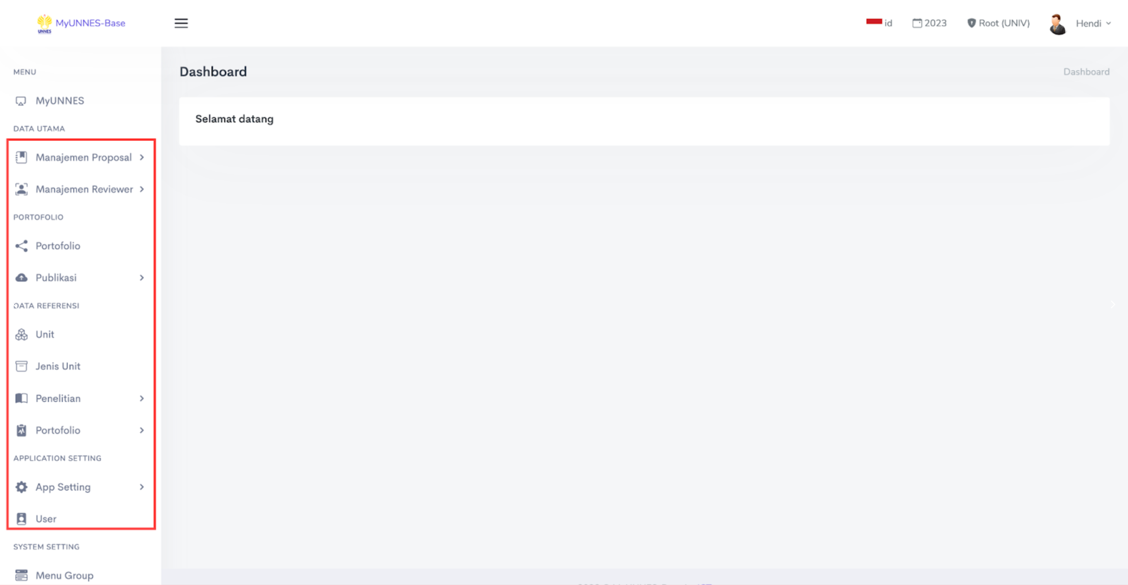 Setiap pengguna akan memiliki role atau kewenangan masing-masing. Sehingga pada halaman dashboard pengguna akan menampilkan menu sesuai dengan kewenangan pengguna tersebut. Contoh halaman dashboard pengguna dapat di lihat pada gambar dibawah ini.