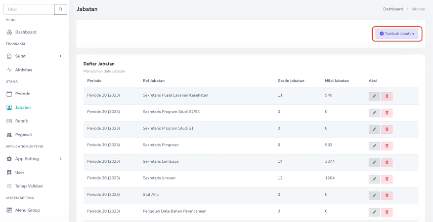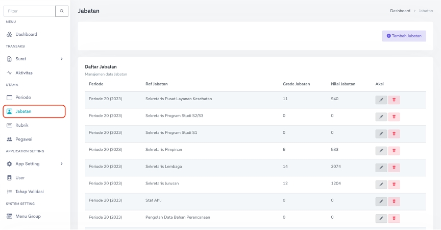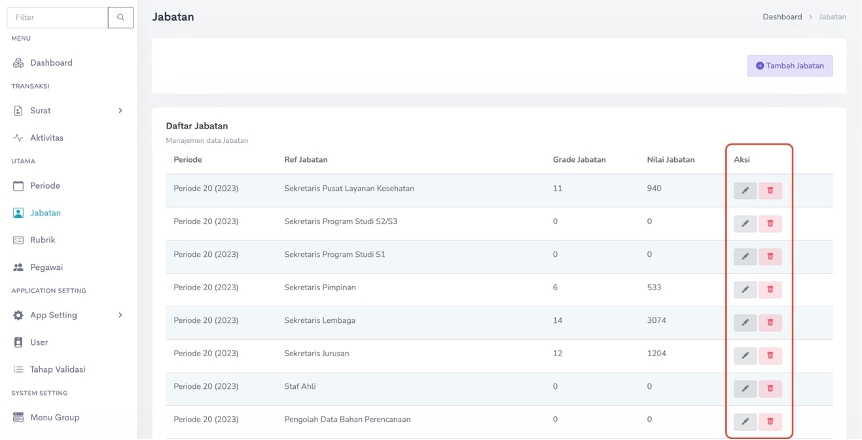 Untuk mengubah data Jabatan remunerasi, dapat dilakukan dengam menekan tombol edit (ikon pensil), dan untuk menghapus data yang sudah ada, bisa menekan tombol hapus (ikon trash) pada tabel data Jabatan pada kolom Aksi, seperti yang ditunjukkan pada gambar berikut: