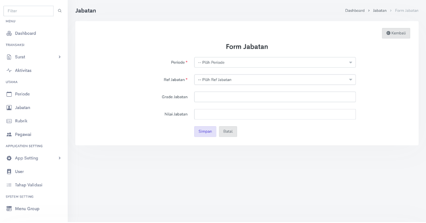 Isikan form pada halaman Form Jabatan untuk menambah data baru. Ketika sudah selesai mengisi semua form, klik tombol Simpan untuk proses menyimpan data.