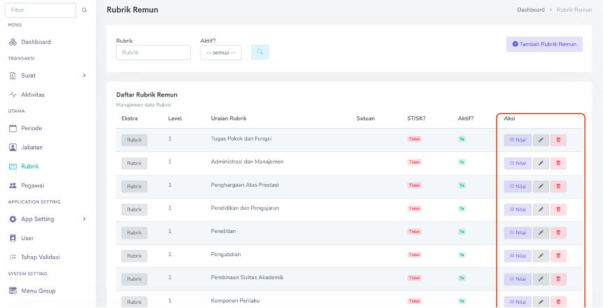 Untuk mengubah data Rubrik remunerasi, dapat dilakukan dengam menekan tombol edit (ikon pensil), dan untuk menghapus data yang sudah ada, bisa menekan tombol hapus (ikon trash) pada tabel data Rubrik pada kolom Aksi, seperti yang ditunjukkan pada gambar berikut: