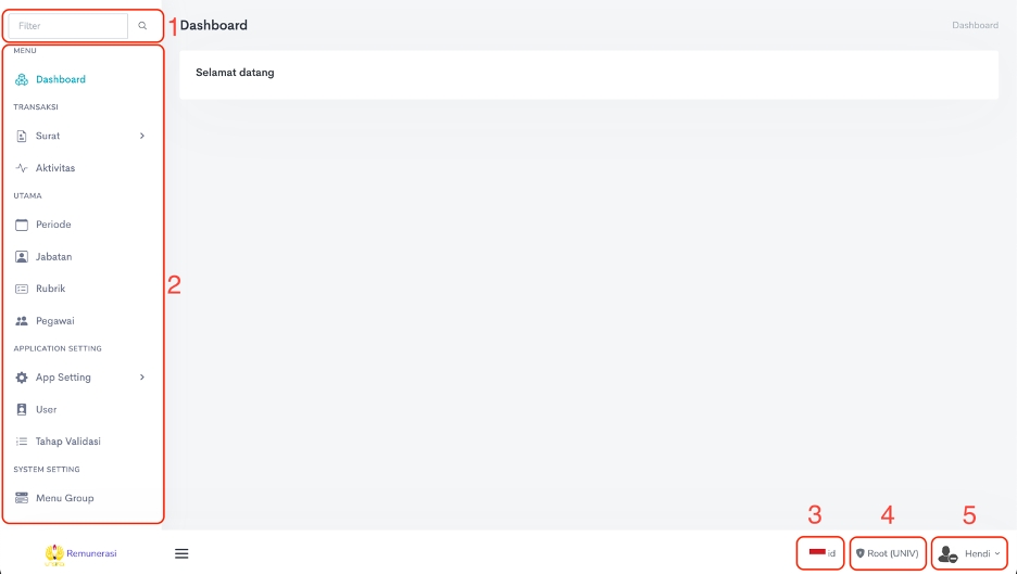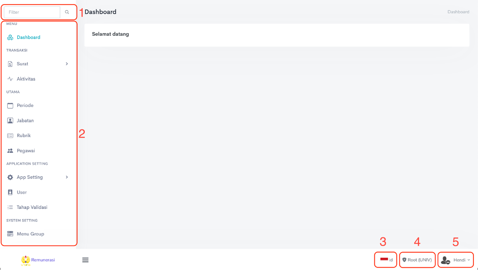 Setiap pengguna akan memiliki role atau kewenangan masing-masing. Sehingga pada halaman dashboard pengguna akan menampilkan menu sesuai dengan kewenangan pengguna tersebut. Contoh halaman dashboard pengguna dapat di lihat pada gambar dibawah ini.