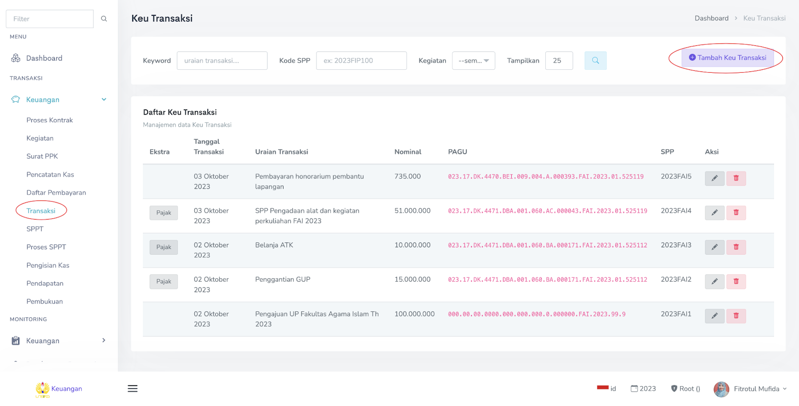 1. Selanjutnya adalah membuat daftar transaksi. Pada group menu Transaksi -> keuangan -> transaksi, klik tombol Tambah Keu Transaksi.