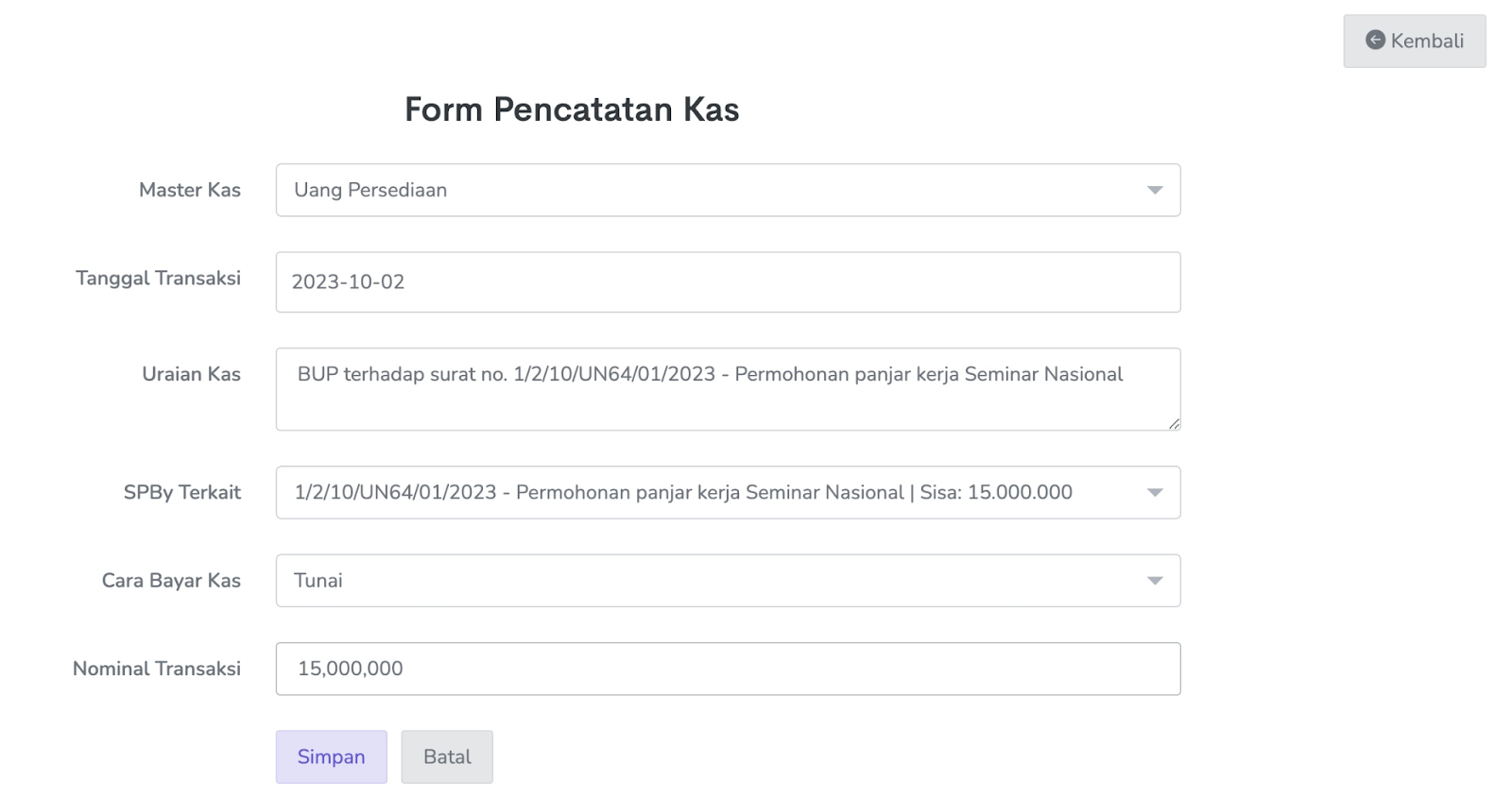 3. Lengkapi isian form pencatatan kas Master Kas di isi dengan SPJ Uang Persediaan, dan akhiri dengan tombol Simpan.