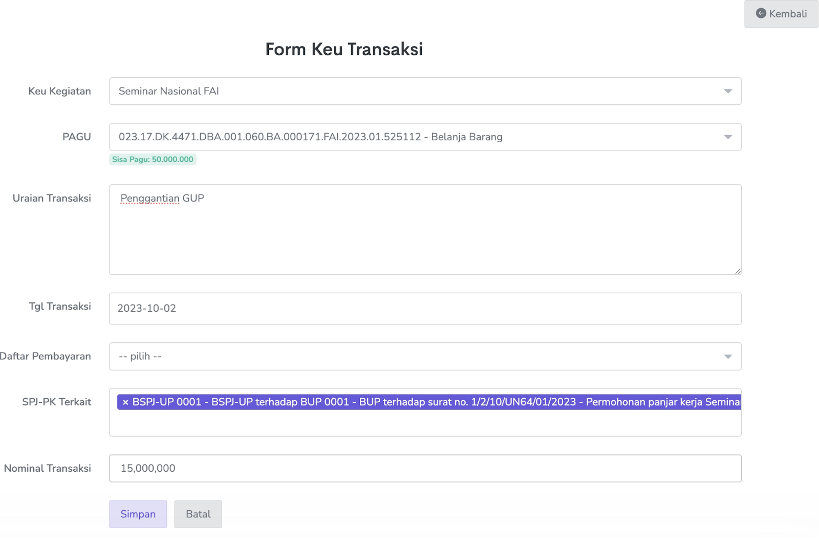 1. Isikan data form keu transaksi. Sebagai contoh dapat dilihat pada gambar di bawah ini :