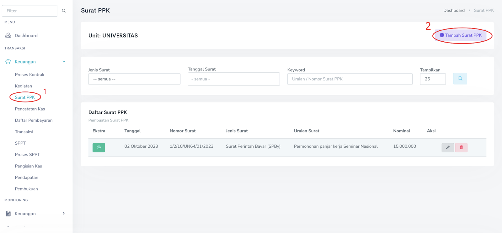 2. Langkah dalam membuat SPBy dengan masuk ke Menu Transaksi → Surat PPK → Tambah Surat PPK.