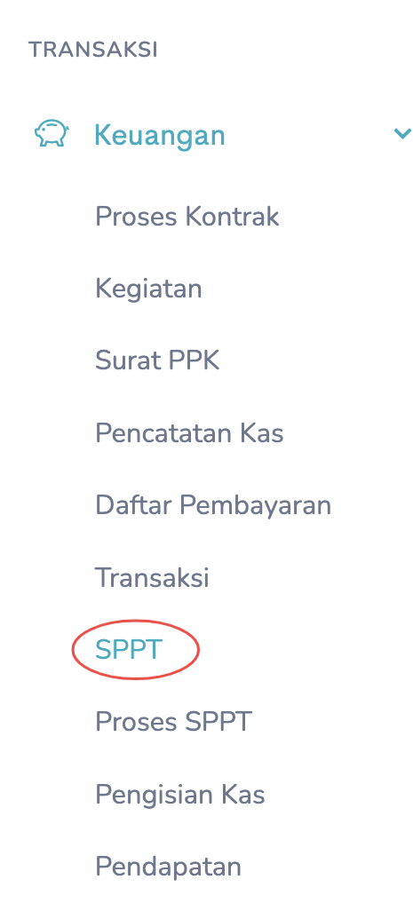 2. Setelah Form Kegiatan dan Transaksi sudah berhasil dibuat, langkah selanjutnya adalah membuat SPPT. Masih dalam group menu Transaksi, silahkan pilih Keuangan -> SPPT.