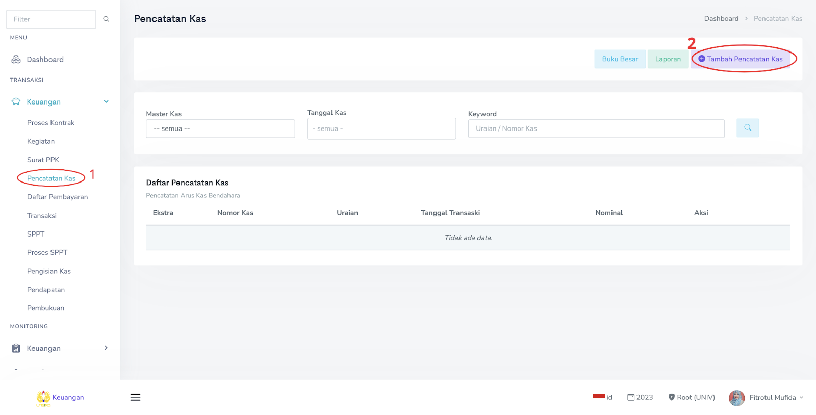 2. Langkah selanjutnya adalah menambahkan pencatatan Kas. Pada group menu Transaksi, silahkan klik Pencatatan Kas -> Tambah Pencatatan Kas.