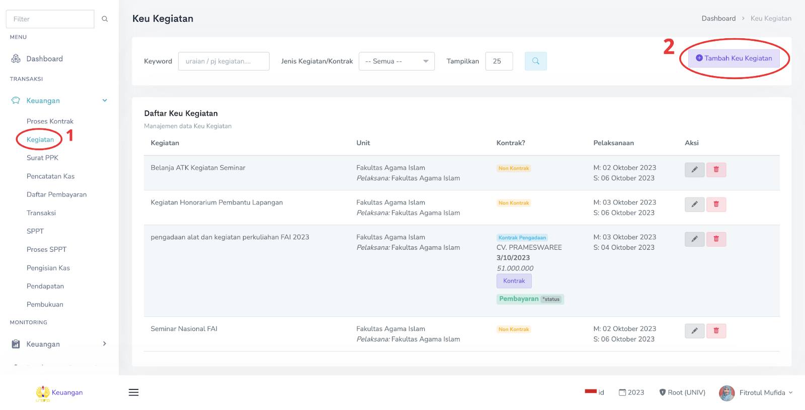 1. Melakukan input kegiatan yang sesuai dengan penggunaan dana di Menu Transaksi → Kegiatan → Tambah Kegiatan → Pilih Pagu Kegiatan