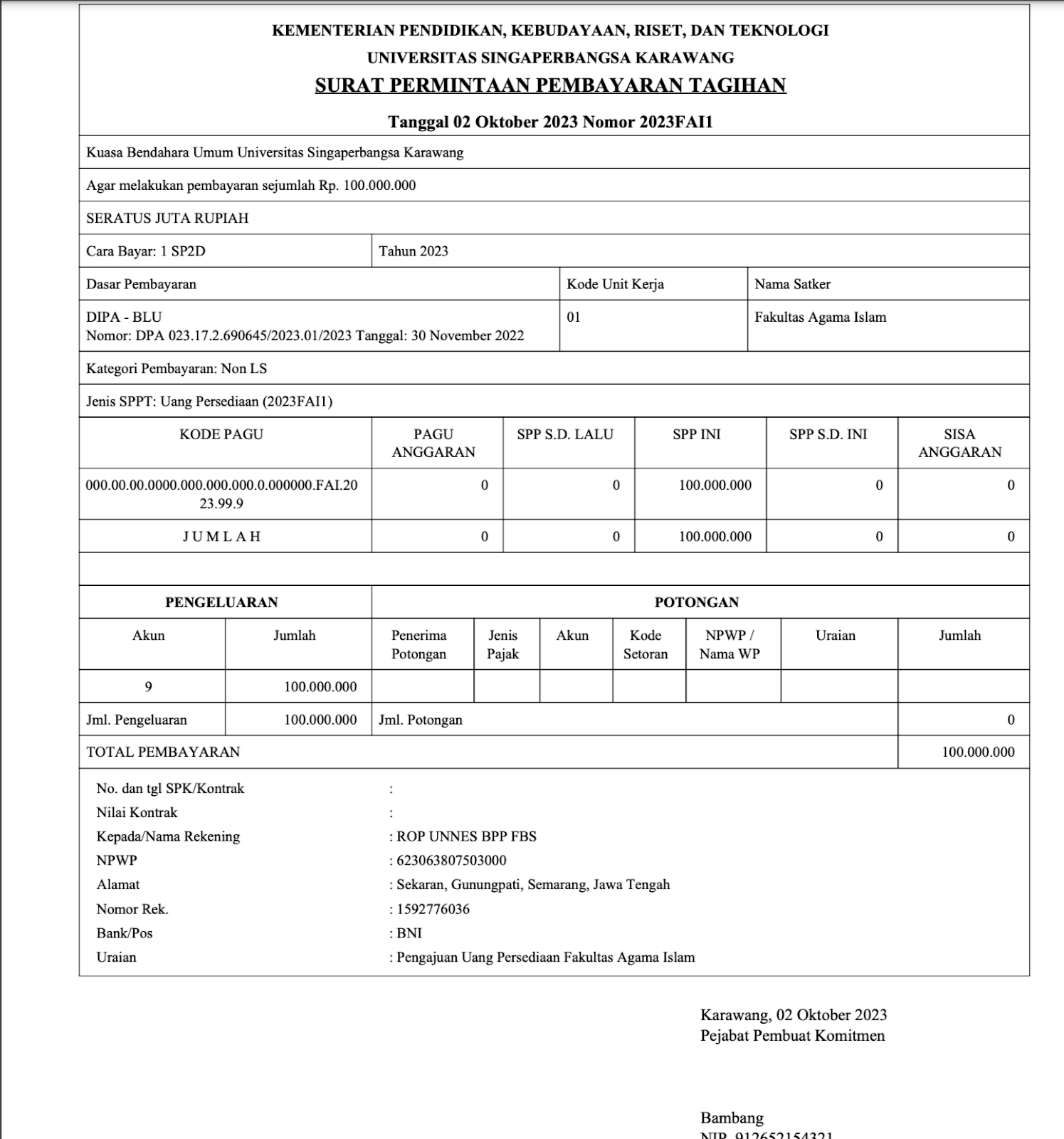 1. Berikut tampilan form SPP Uang Persediaan yang telah di cetak