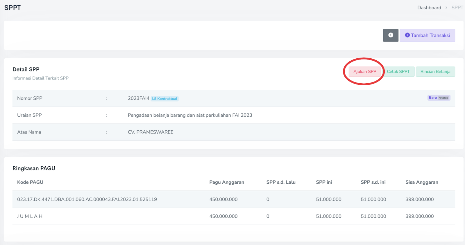 1. Setelah dokumen yang diminta di upload, silahkan klik kembali dan Klik Extra → Transaksi → Ajukan SPP → Konfirmasi Pengajuan SPP ke Penguji.