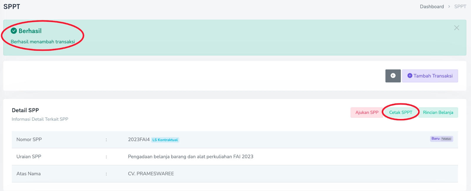 Setelah memasukan transaksi ke dalam SPP Uang Persediaan, langkah pembuatan SPP telah selesai dan proses selanjutnya adalah mencetak SPP dan Surat Pertanggungjawaban Belanja. Menu cetak ada di Ekstra → Aksi → Transaksi → Cetak SPPT dan Cetak Rincian Belanja.