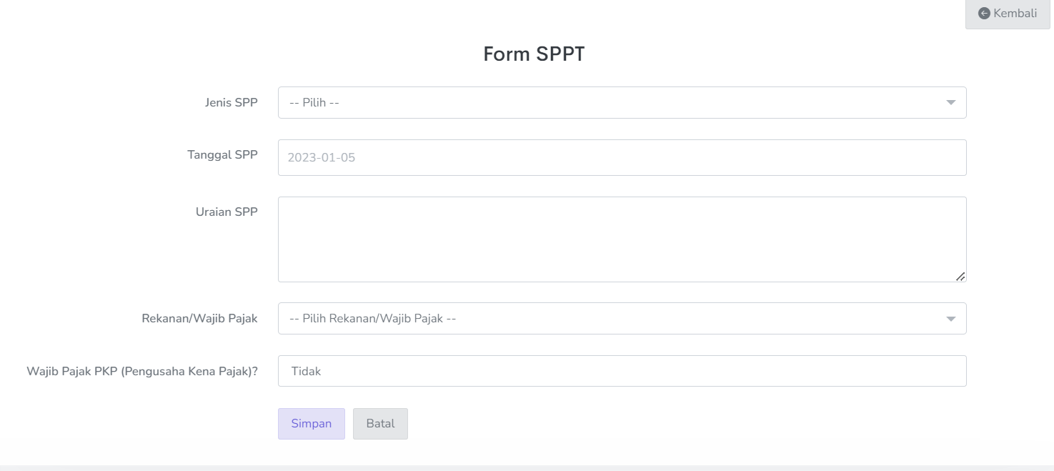 1. Setelah Klik Tambah SPPT → Isi Data SPP yang dibutuhkan, untuk jenis SPP silahkan pilih Uang Persediaan (UP) dan klik Simpan.