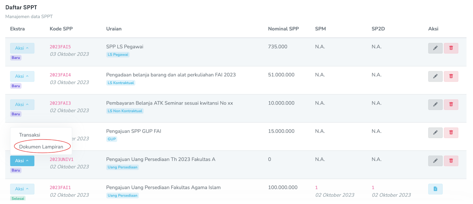 1. Setelah Dokumen SPP dan SPTJB (Surat Pernyataan Tanggungjawab Belanja) di cetak dan dimintakan tanda tangan oleh Pejabat terkait silahkan di scan untuk pengajuan SPP secara online dalam sistem. Menu upload dokumen sebelum diajukan ada di Ekstra → Aksi → Dokumen Lampiran → Tambah Dokumen → Upload Dokumen yang sesuai yang diminta.
