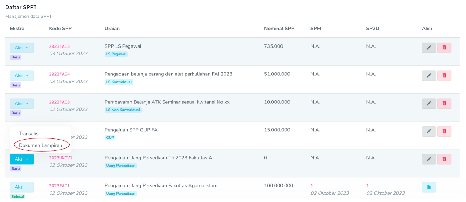 Setelah Dokumen SPP dan SPTJB (Surat Pernyataan Tanggungjawab Belanja) di cetak dan dimintakan tanda tangan oleh Pejabat terkait silahkan di scan untuk pengajuan SPP secara online dalam sistem. Menu upload dokumen sebelum diajukan ada di Ekstra → Aksi → Dokumen Lampiran → Tambah Dokumen → Upload Dokumen yang sesuai yang diminta.