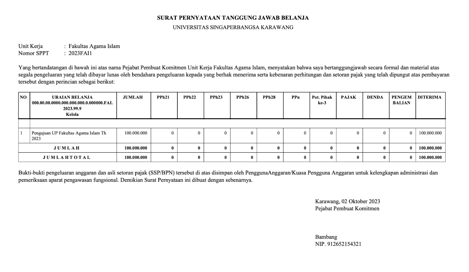 1. Berikut tampilan Cetak Surat Pernyataan Tanggungjawab Belanja