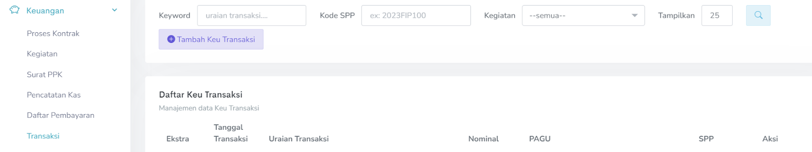 1. Masuk ke Menu Transaksi → Keuangan → Transaksi seperti gambar di bawah ini.