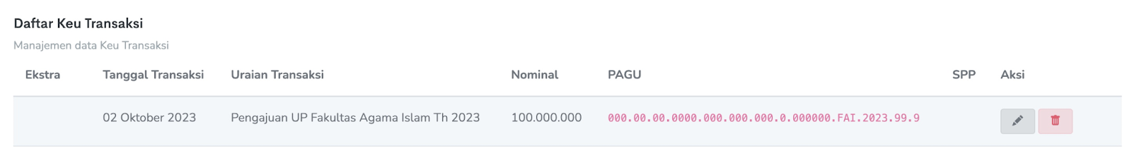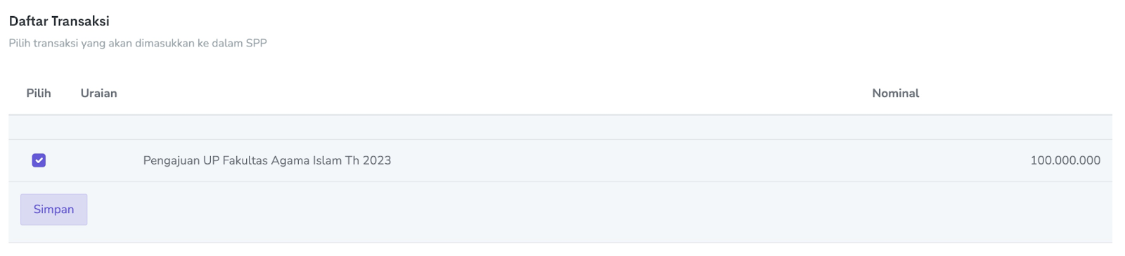1. Setelah klik simpan SPP Uang Persediaan sudah dibuat langkah selanjutnya adalah memasukan Transaksi yang telah dibuat tahap sebelumnya ke SPP Uang Persediaan yang telah dibuat dengan memilih SPP Uang Persediaan → Ekstra → Aksi → Transaksi → Tambah Transaksi → Pilih Transaksi → Centang → Simpan.