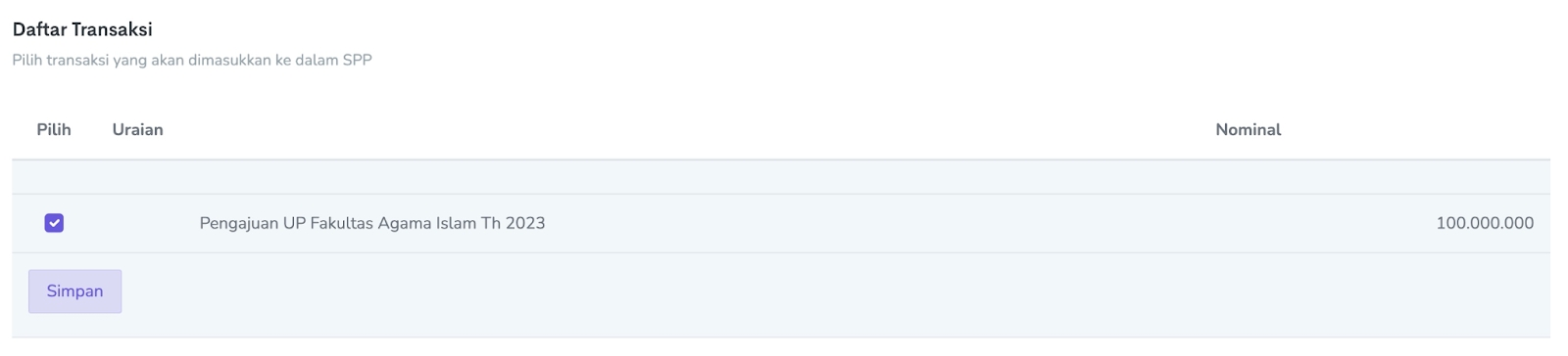 Setelah klik simpan SPP Uang Persediaan sudah dibuat langkah selanjutnya adalah memasukan Transaksi yang telah dibuat tahap sebelumnya ke SPP Uang Persediaan yang telah dibuat dengan memilih SPP Uang Persediaan → Ekstra → Aksi → Transaksi → Tambah Transaksi → Pilih Transaksi → Centang → Simpan.