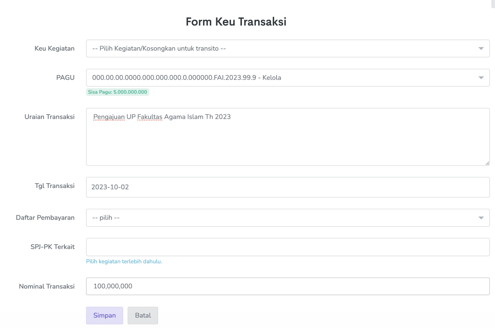 1. Setelah masuk ke Menu Transaksi → Tambah Transaksi → Isi Data sesuai dengan yang dibutuhkan. Tampilan seperti gambar di bawah ini